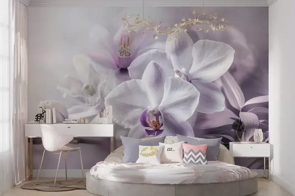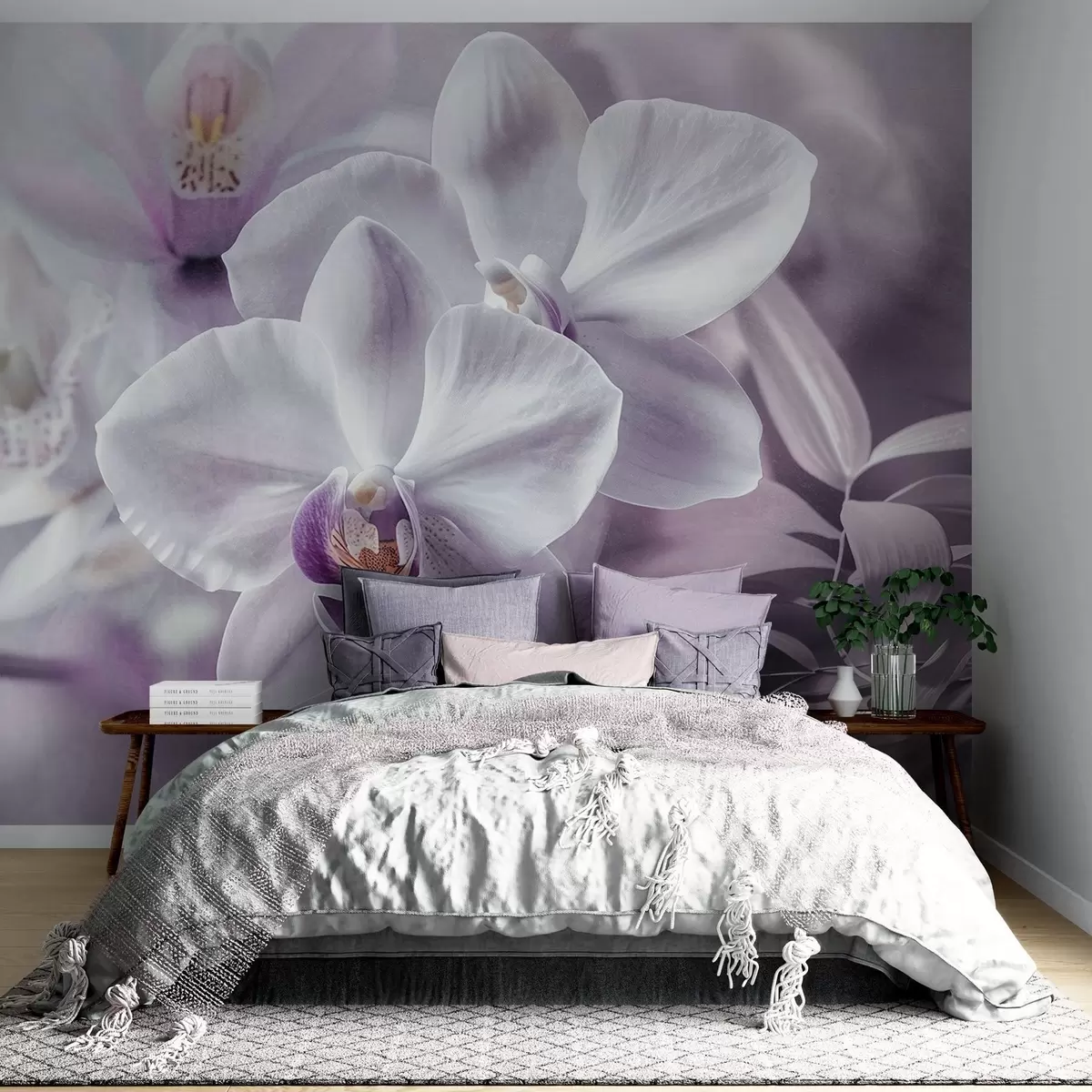 Valokuvatapetti Valkoisia ja liloja herkkiä orkideakukkia, pehmeä valaistus ja sumea kuvioitu tausta Nr w09155