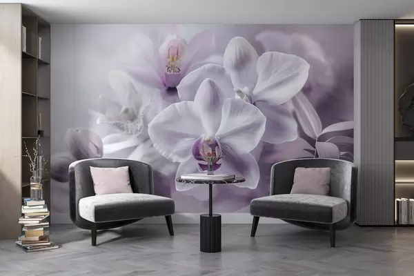 Valokuvatapetti Valkoisia ja liloja herkkiä orkideakukkia, pehmeä valaistus ja sumea kuvioitu tausta Nr w09155