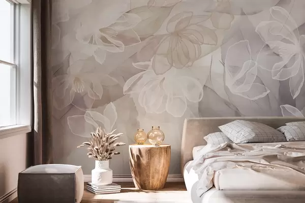 Valokuvatapetti Kukat ja lehdet, joiden terälehdet ovat läpinäkyviä valkoisen, beigen ja violetin sävyissä, pehmeät ja herkät Nr w09158