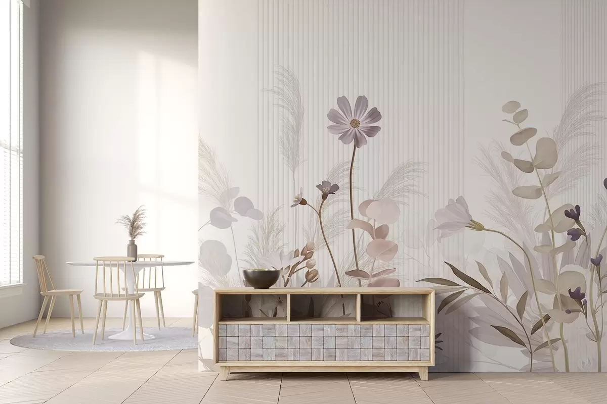 Valokuvatapetti Kukkia pastelliväreissä, vaaleanruskeita lehtiä, valkoinen tausta, jossa on pystysuoria viivoja, tyylikäs ja minimalistinen Nr w09161