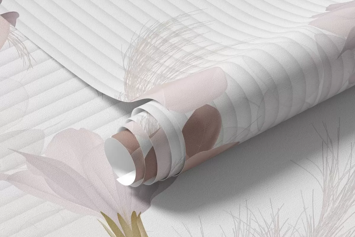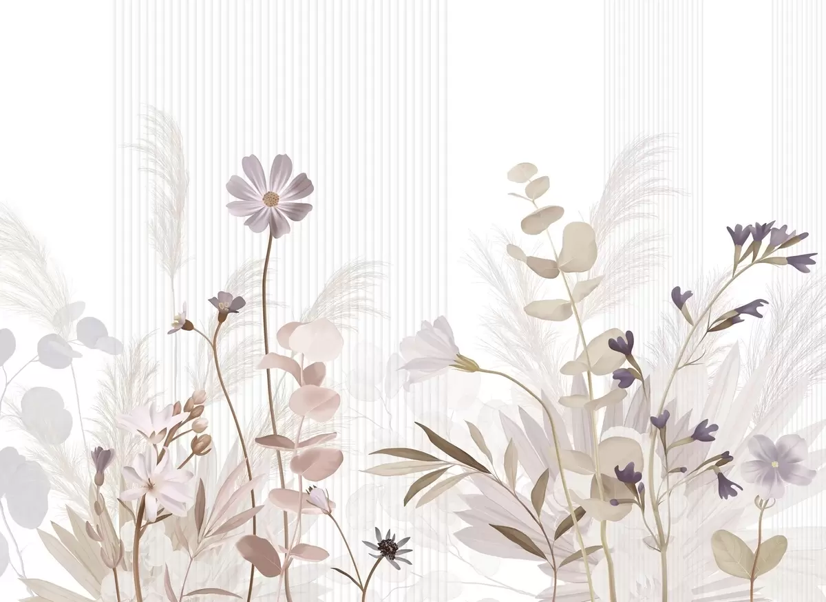 Valokuvatapetti Kukkia pastelliväreissä, vaaleanruskeita lehtiä, valkoinen tausta, jossa on pystysuoria viivoja, tyylikäs ja minimalistinen Nr w09161