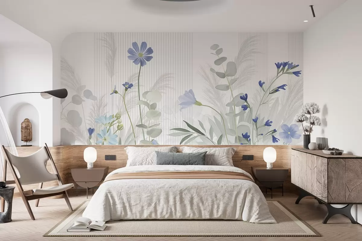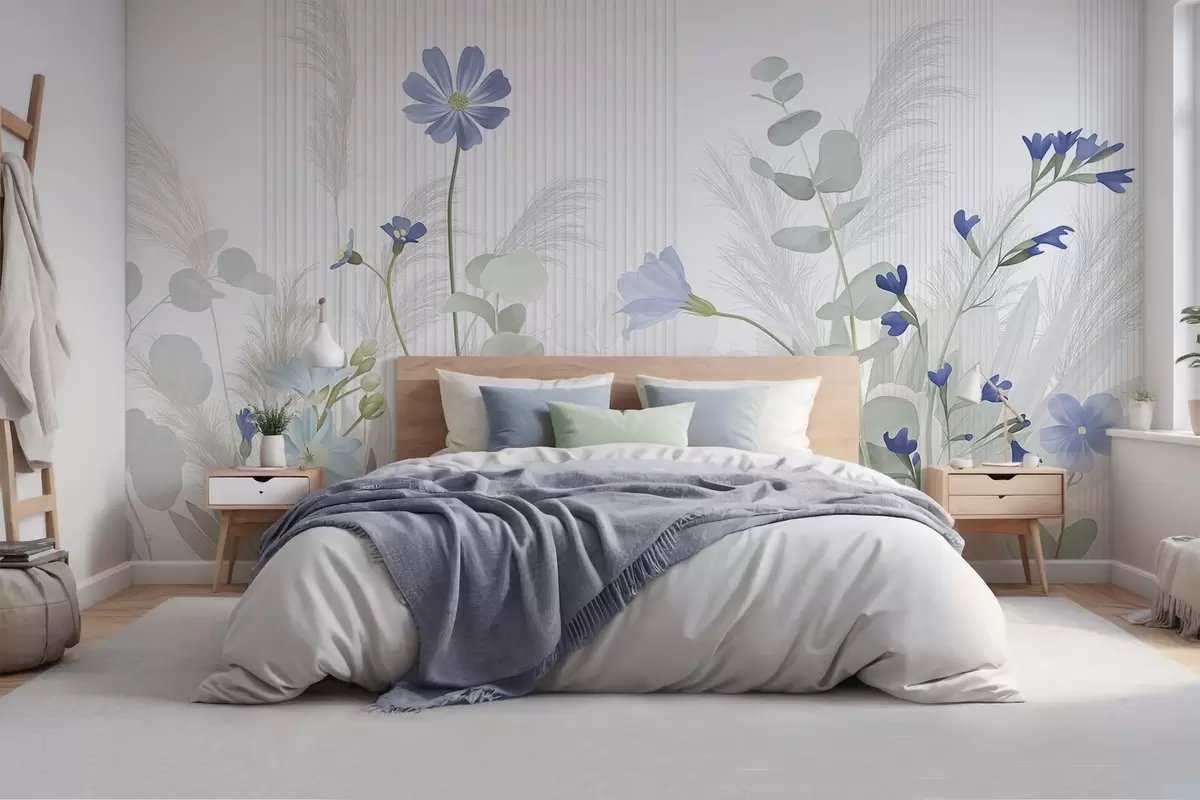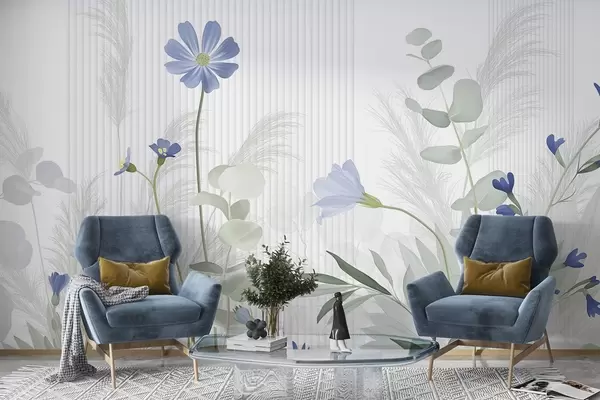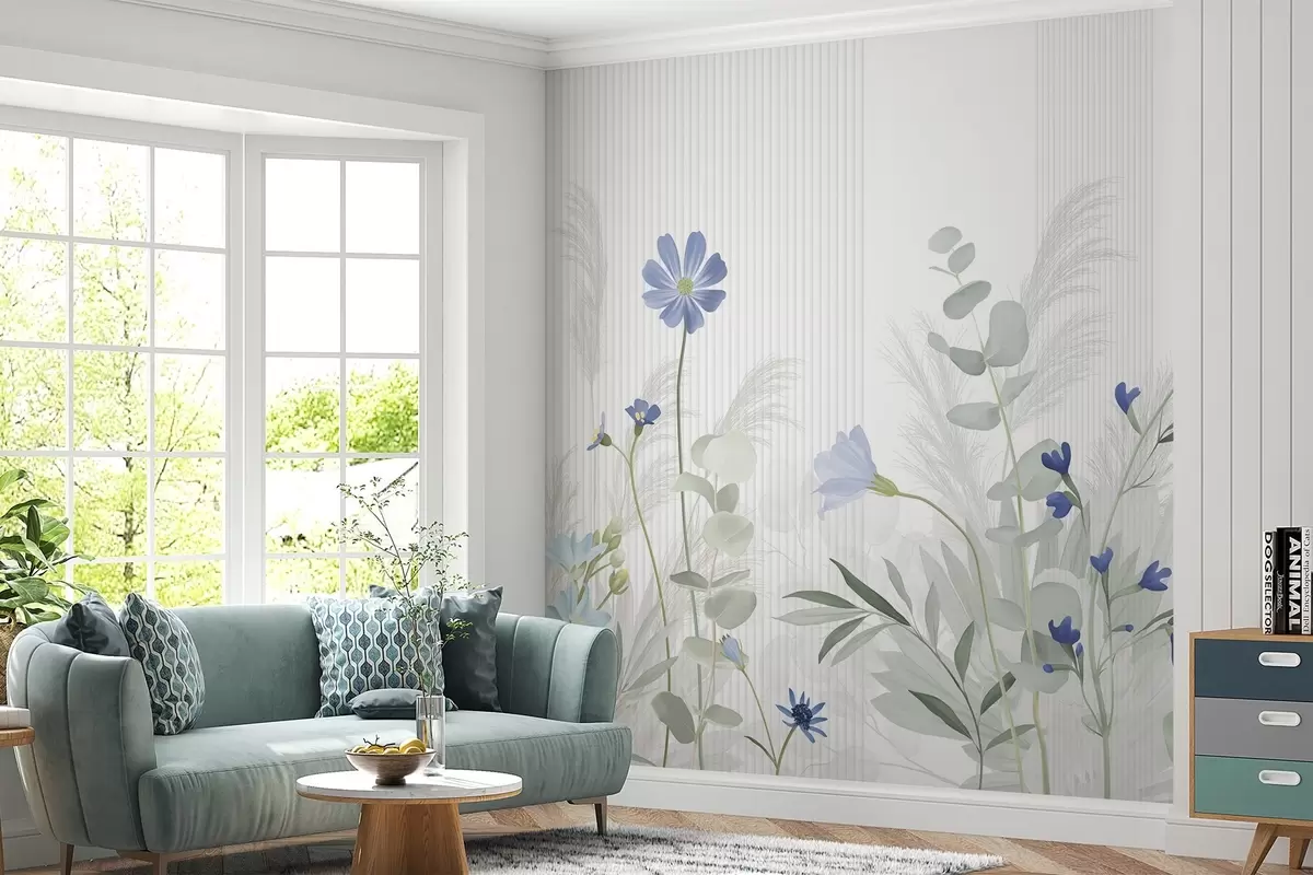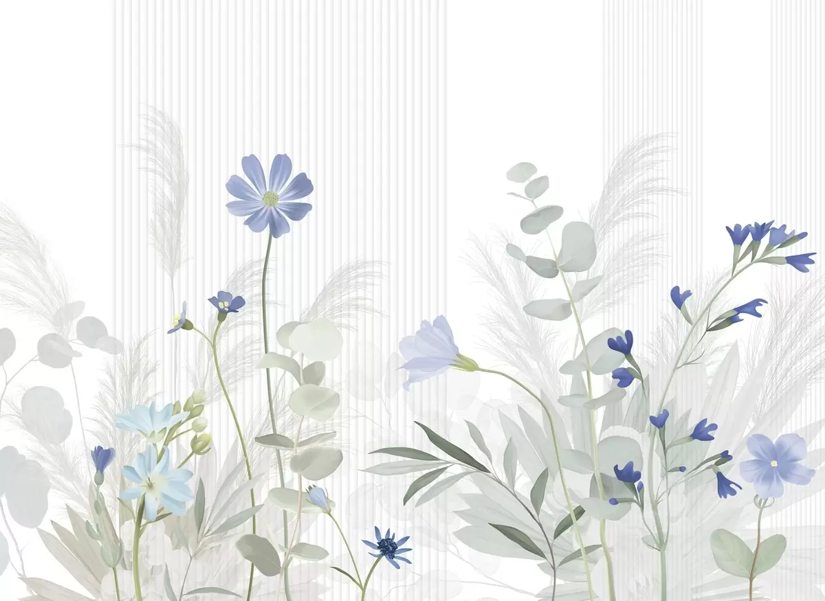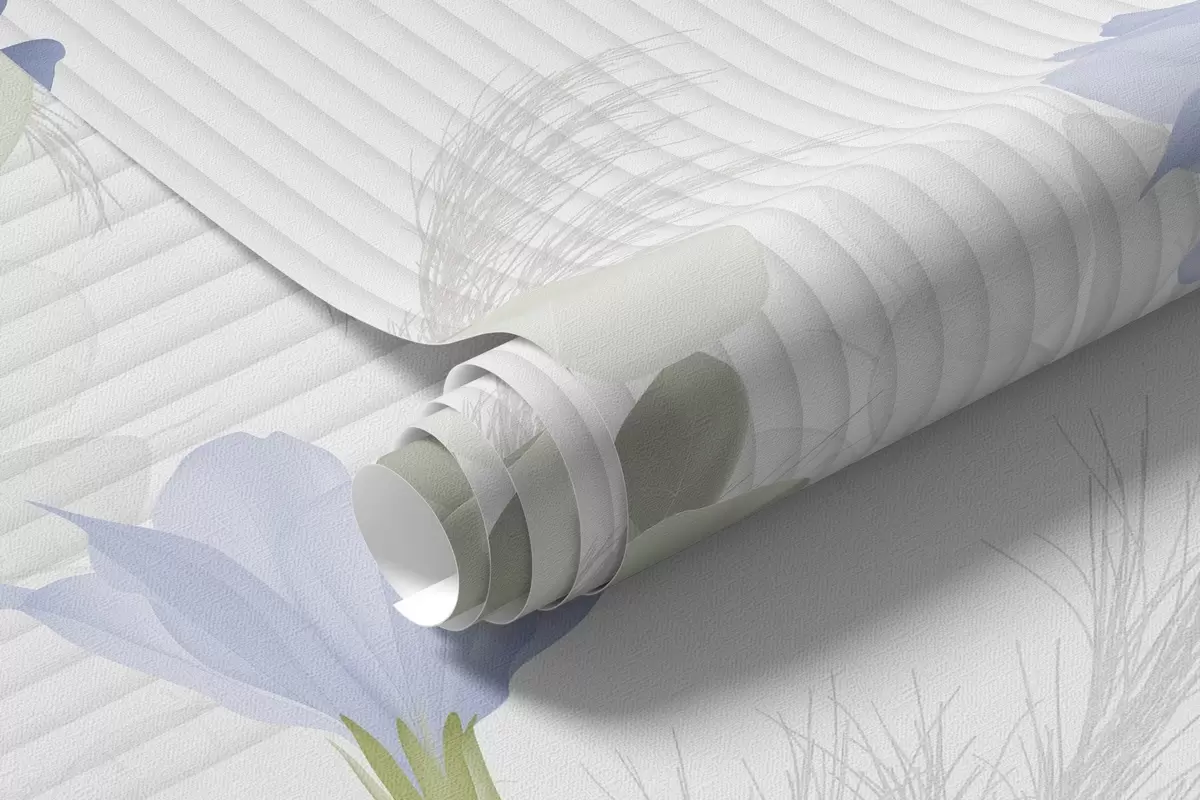 Valokuvatapetti Kukkia pastelliväreissä, vaaleanvihreät lehdet, valkoinen tausta pystysuorilla viivoilla, tyylikäs ja minimalistinen Nr w09161v1