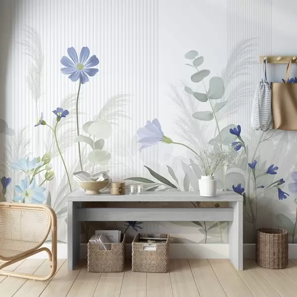 Valokuvatapetti Kukkia pastelliväreissä, vaaleanvihreät lehdet, valkoinen tausta pystysuorilla viivoilla, tyylikäs ja minimalistinen Nr w09161v1