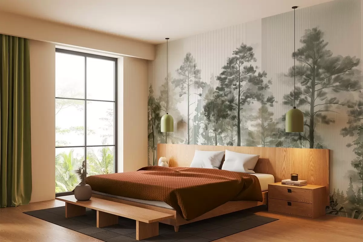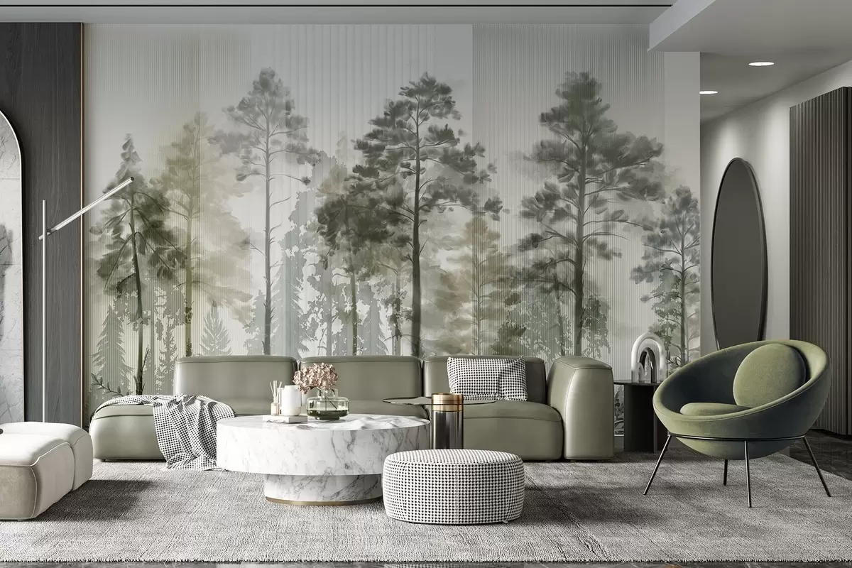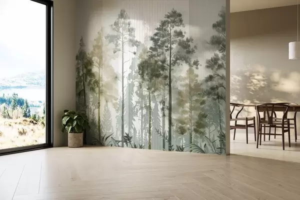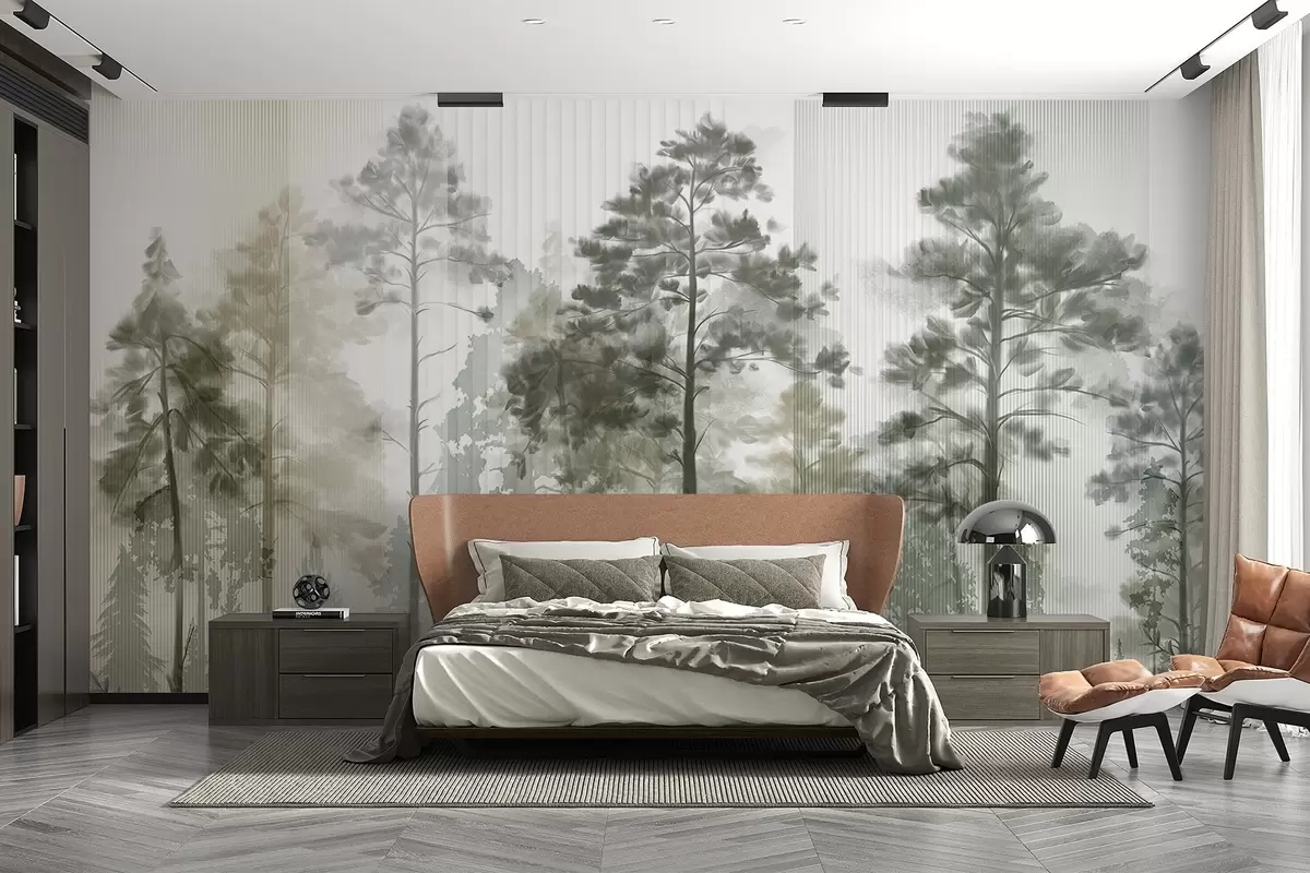 Valokuvatapetti Tiheä metsä, jossa on korkeita mäntyjä, rehevä vihreä lehdistö, sumuinen tunnelma ja pystysuorat linjat tekstuurit Nr w09163