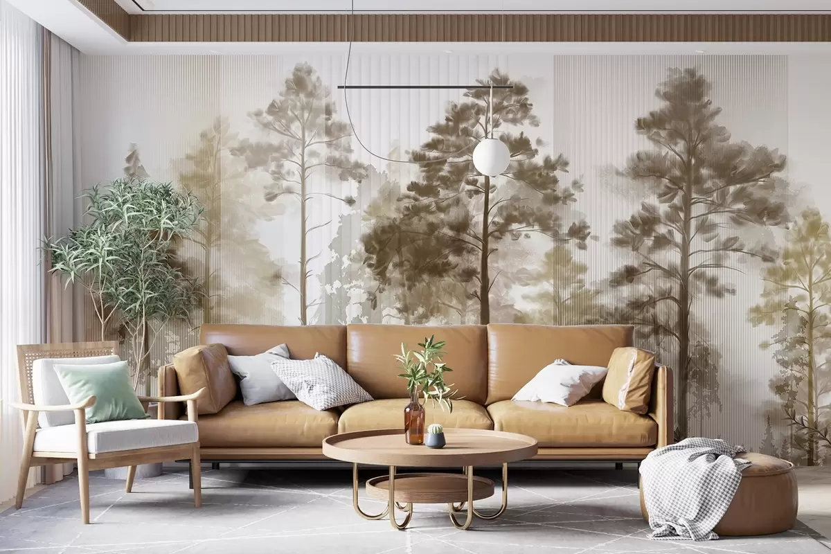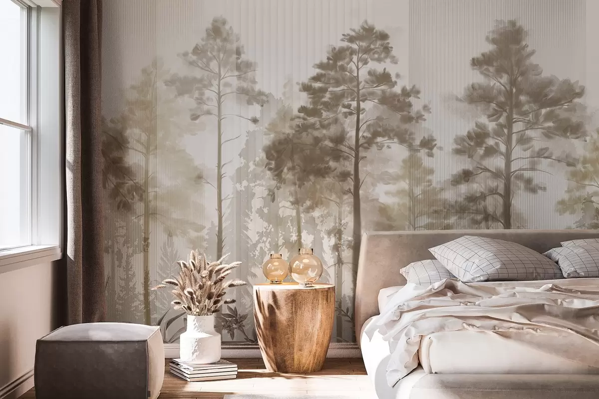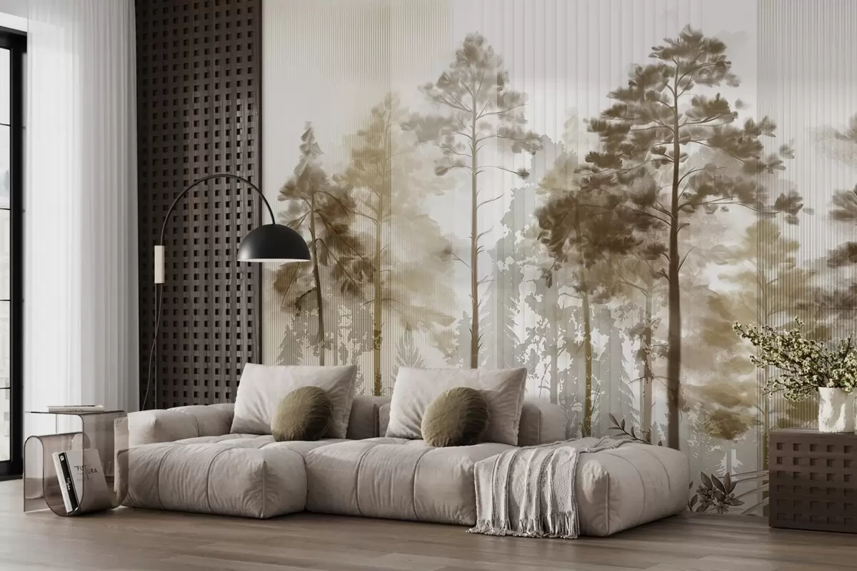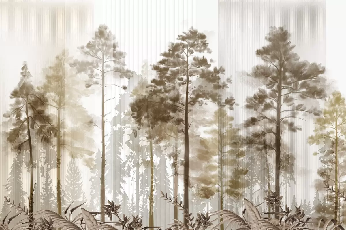 Valokuvatapetti Tiheä metsä, jossa on korkeita mäntyjä, rehevä beige lehvistö, sumuinen tunnelma ja pystysuorat linjat tekstuurit Nr w09163v1