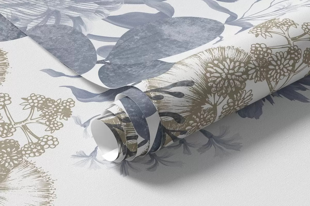 Valokuvatapetti Vintage-kukka-asetelma, jossa ruusuja, eukalyptusta ja mimosaa sinisen ja ruskean sävyissä Nr w09164