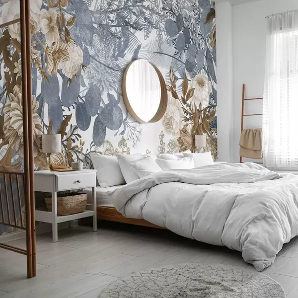 Valokuvatapetti Vintage-kukka-asetelma, jossa ruusuja, eukalyptusta ja mimosaa sinisen ja ruskean sävyissä Nr w09164
