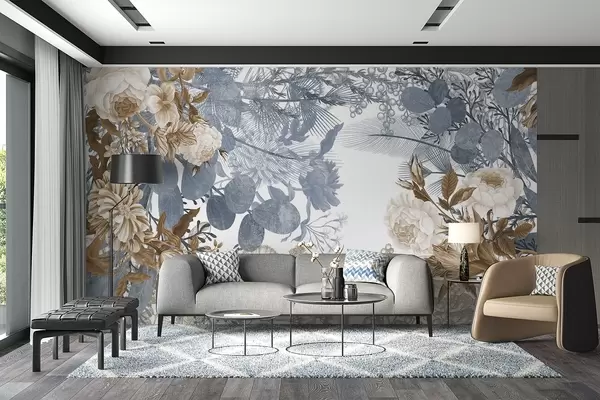 Valokuvatapetti Vintage-kukka-asetelma, jossa ruusuja, eukalyptusta ja mimosaa sinisen ja ruskean sävyissä  w09164