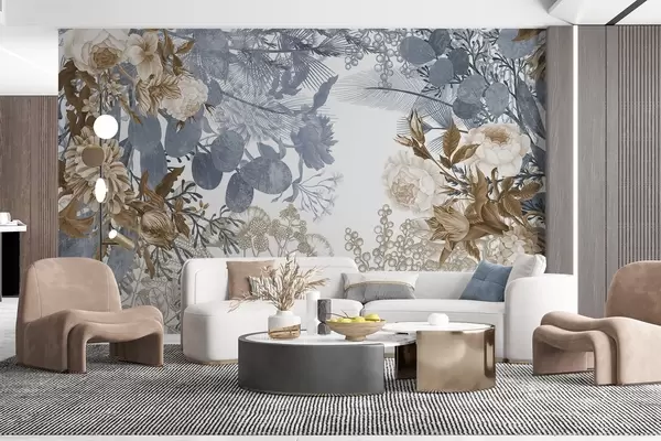 Valokuvatapetti Vintage-kukka-asetelma, jossa ruusuja, eukalyptusta ja mimosaa sinisen ja ruskean sävyissä Nr w09164