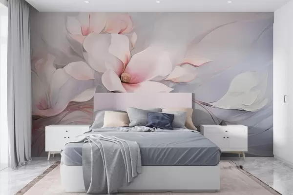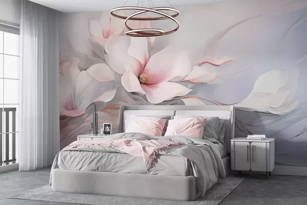 Valokuvatapetti Herkät magnolian kukat, joissa vaaleanpunaiset terälehdet ja valkoiset lehdet, sileä rakenne, virtaavat linjat Nr w09165