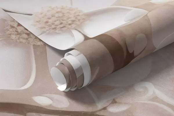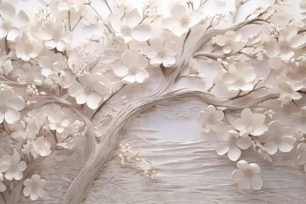 Valokuvatapetti Kuvioitu puu, jossa on valkoisia kukkia ja ruskea runko, tausta on valkoinen vaakasuorilla viivoilla pehmeä valaistus Nr w09166