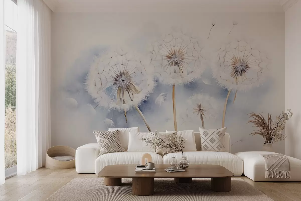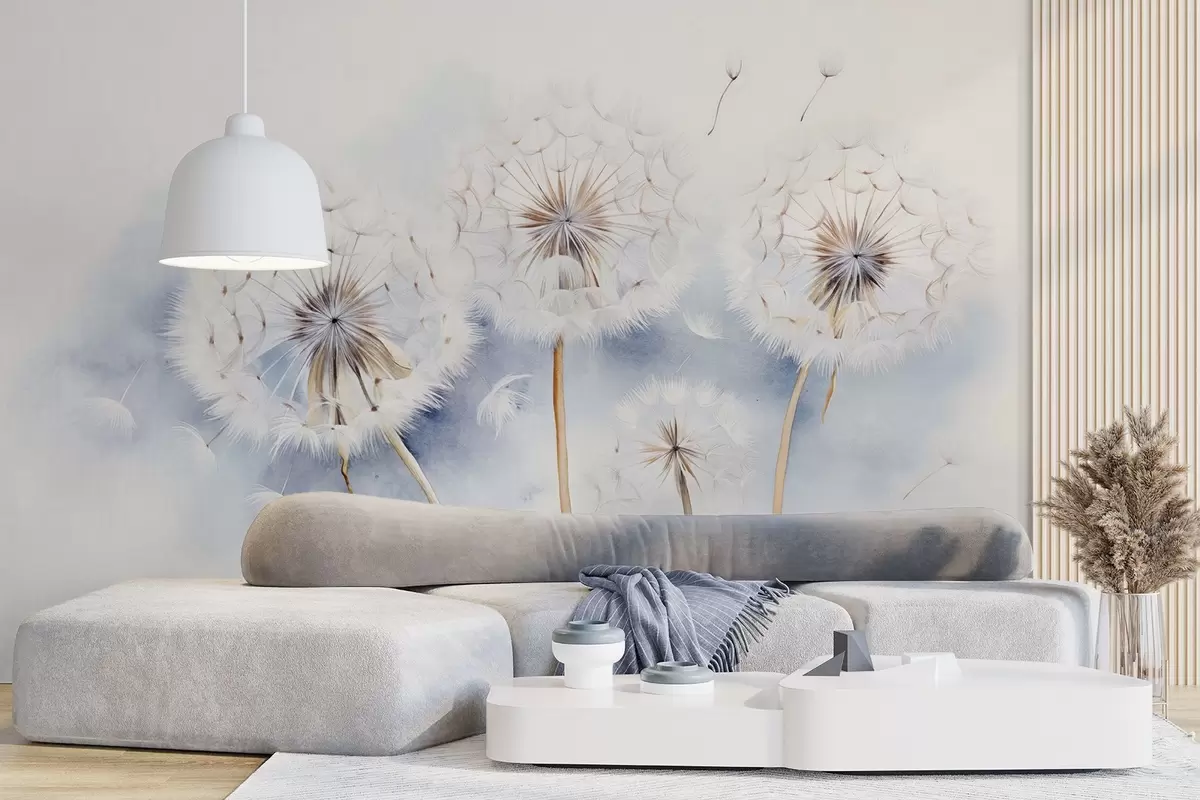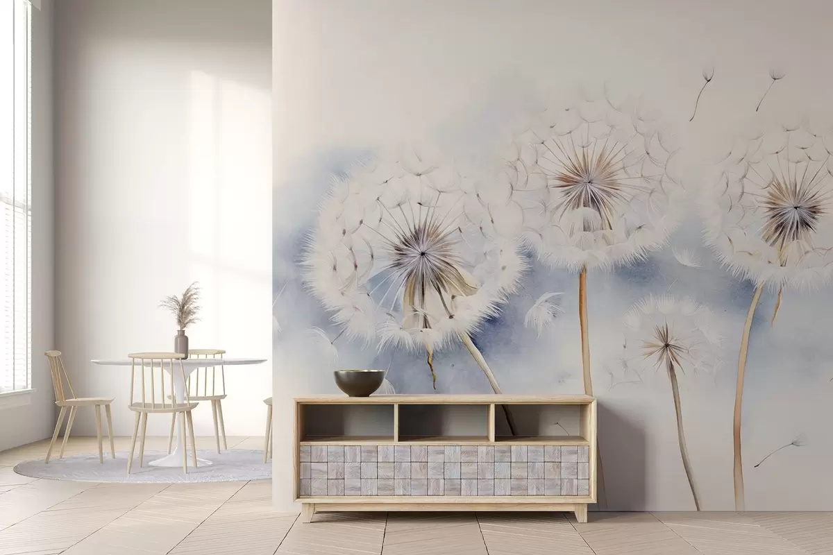Valokuvatapetti Teksturoituja voikukkia, joiden siemenet leijuvat ilmassa, vaaleansininen ja valkoinen tausta, pehmeä herkkä piirustustyyli Nr w09190