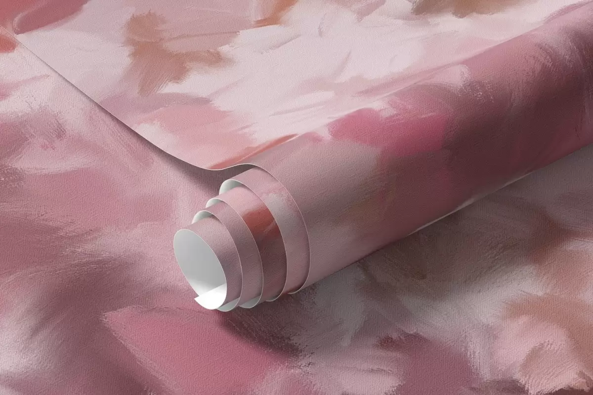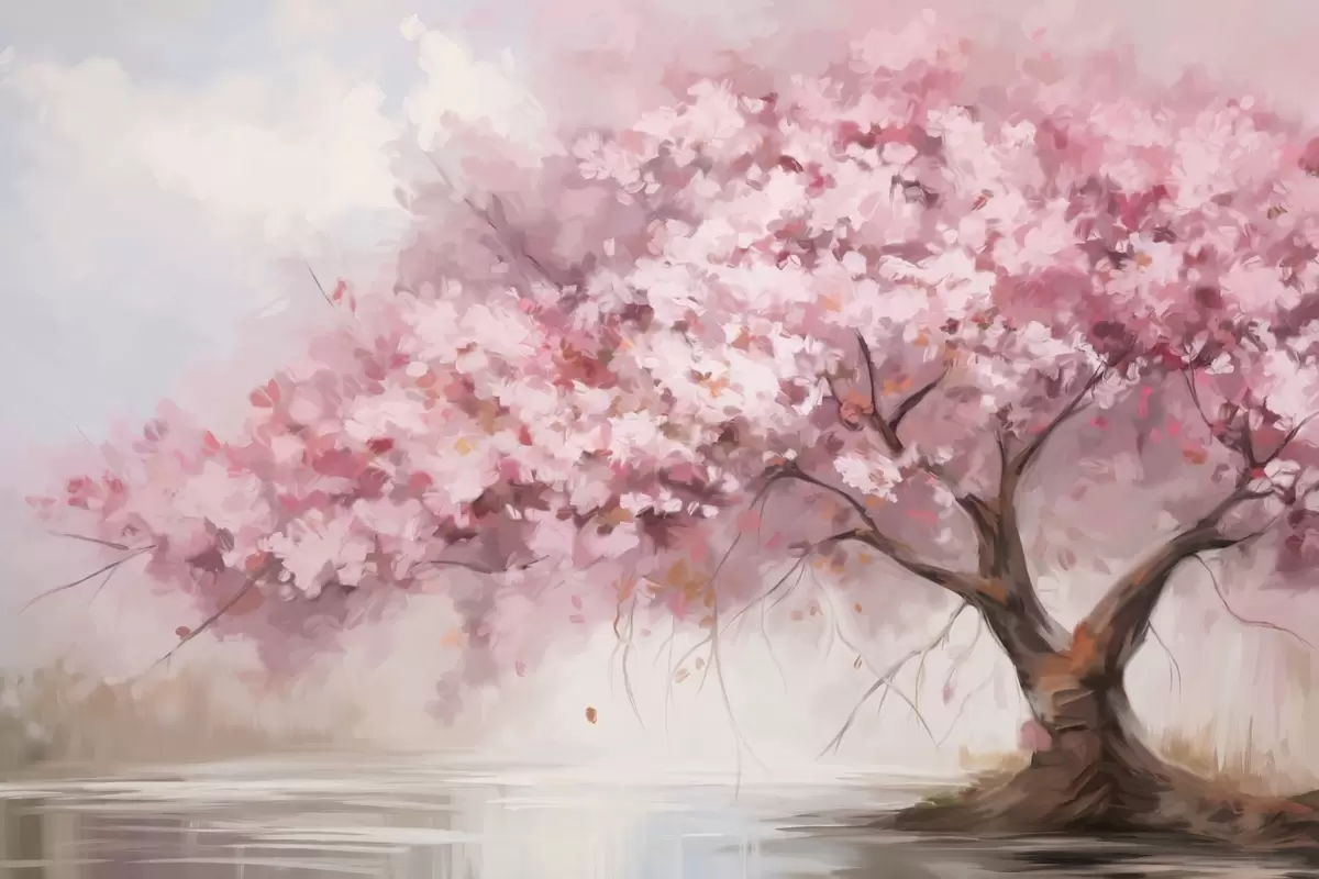 Valokuvatapetti Abstrakti vaaleanpunainen kukkiva puu täydessä kukassa, joen vieressä, pehmeä kuvioitu siveltimenvedot ja pastellivärit Nr w09193