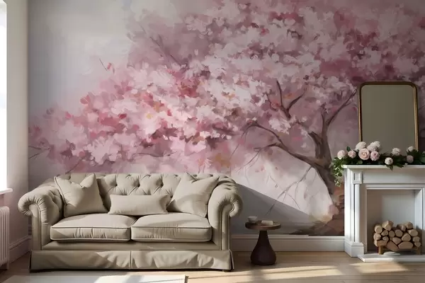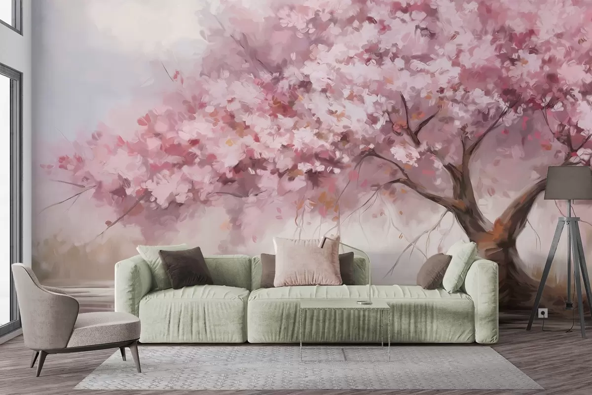 Valokuvatapetti Abstrakti vaaleanpunainen kukkiva puu täydessä kukassa, joen vieressä, pehmeä kuvioitu siveltimenvedot ja pastellivärit w09193