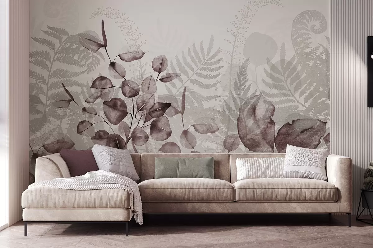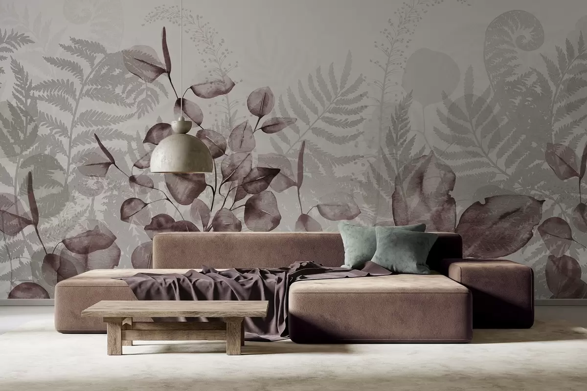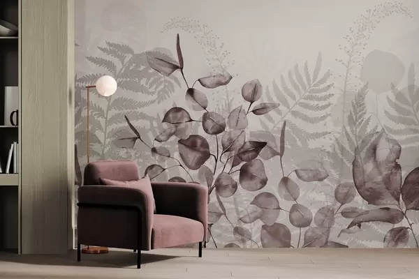 Valokuvatapetti Eukalyptuksen ja saniaisen lehdet bordon ja harmaan sävyissä, vesiväriefekti , kasvitieteellinen kuvitus Nr w09197v1