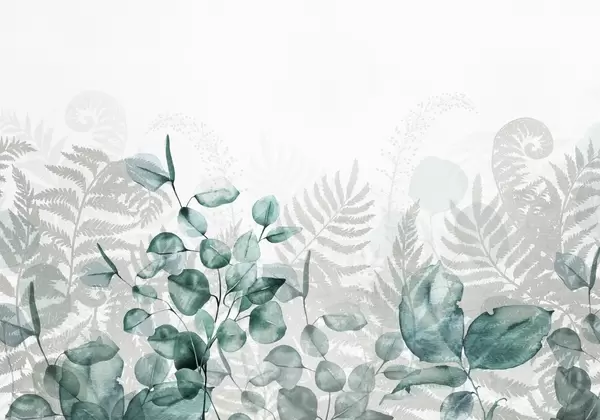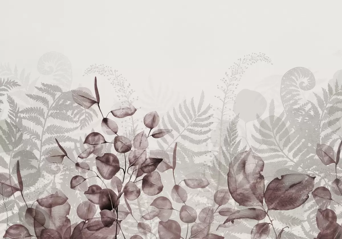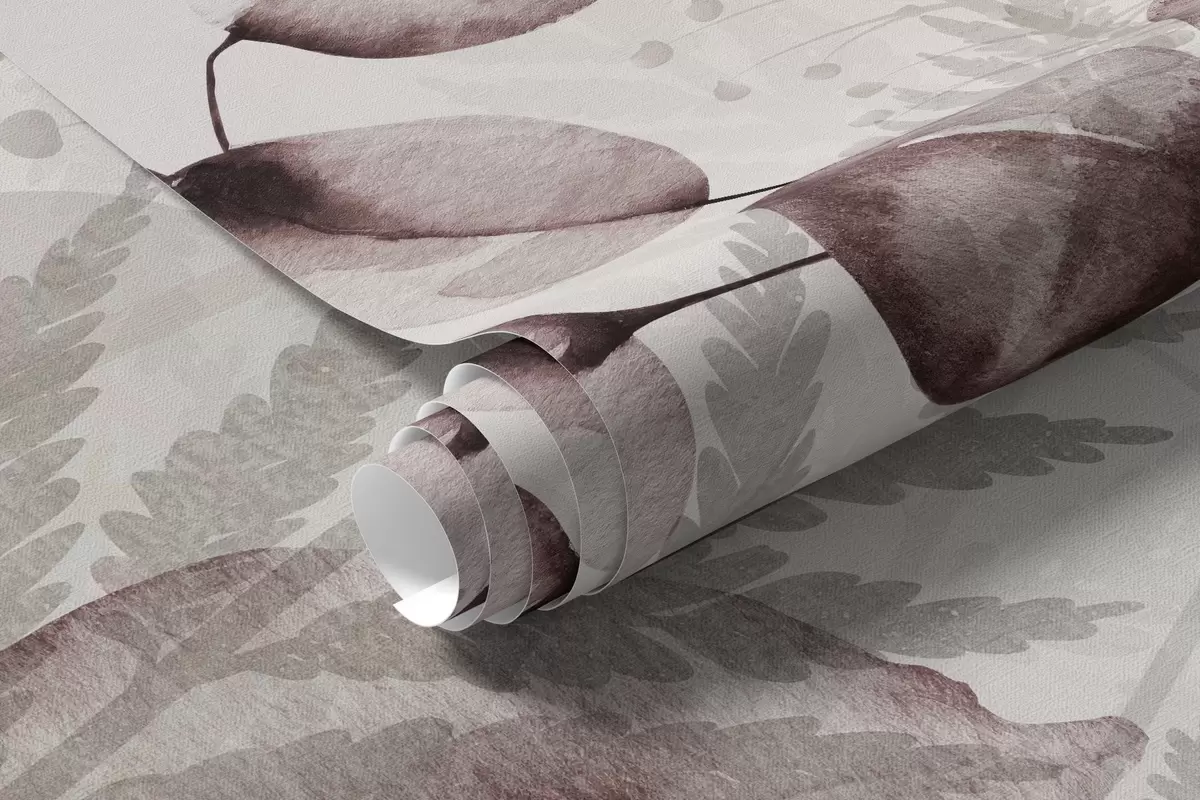 Valokuvatapetti Eukalyptuksen ja saniaisen lehdet bordon ja harmaan sävyissä, vesiväriefekti , kasvitieteellinen kuvitus Nr w09197v1