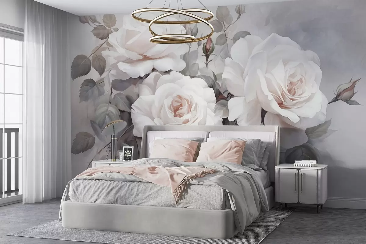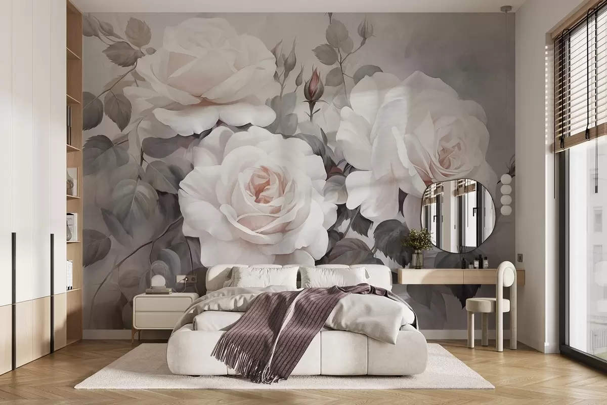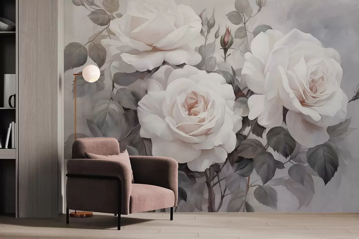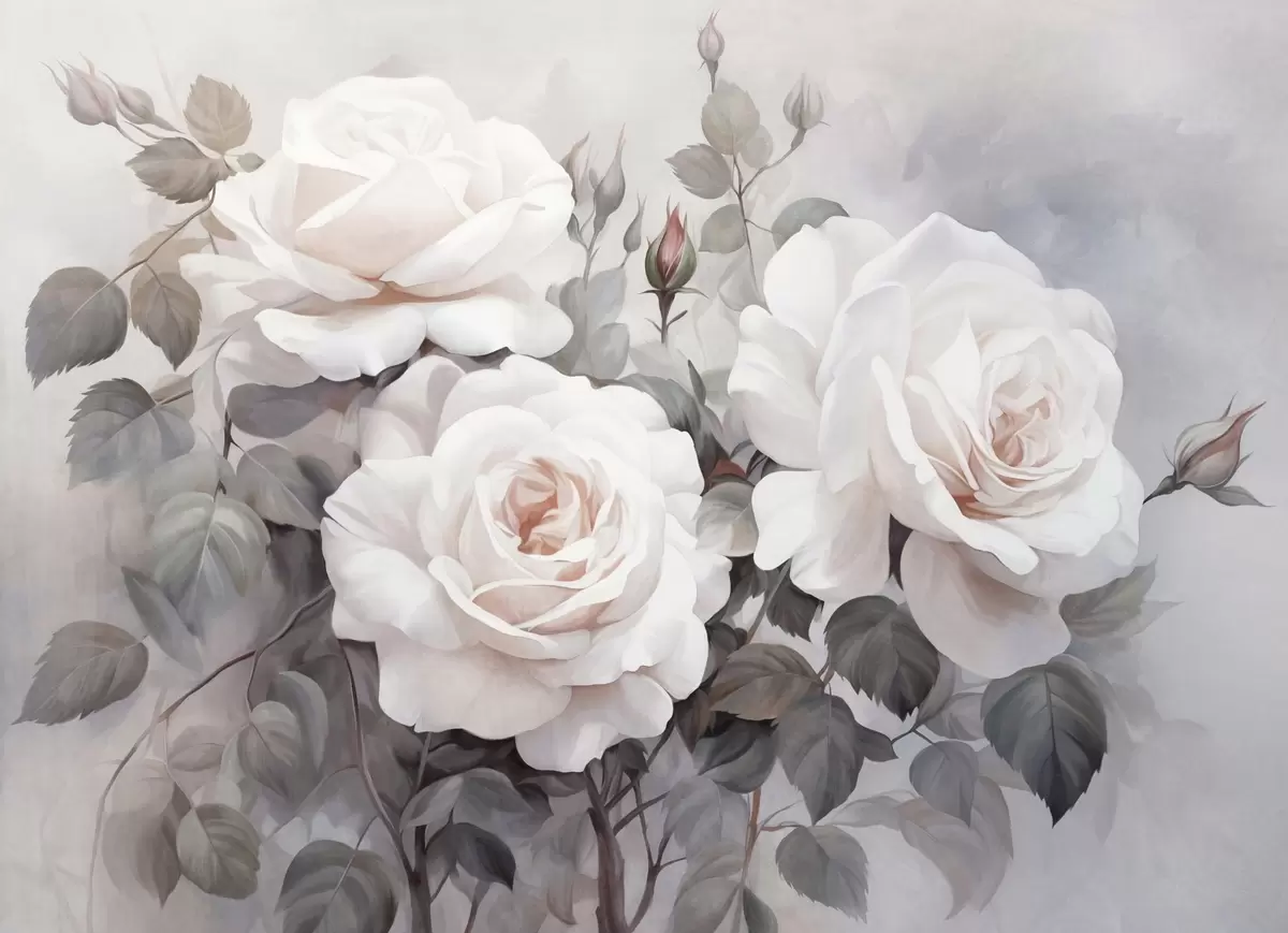 Valokuvatapetti Teksturoitu valkoisia ruusuja lehdet ja varret, pehmeä vaimennettu pastellivärit, tyylikäs vintage tyyli , herkkä siveltimenvedot Nr w09198