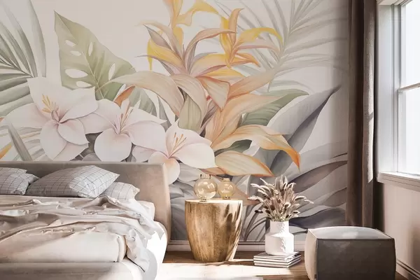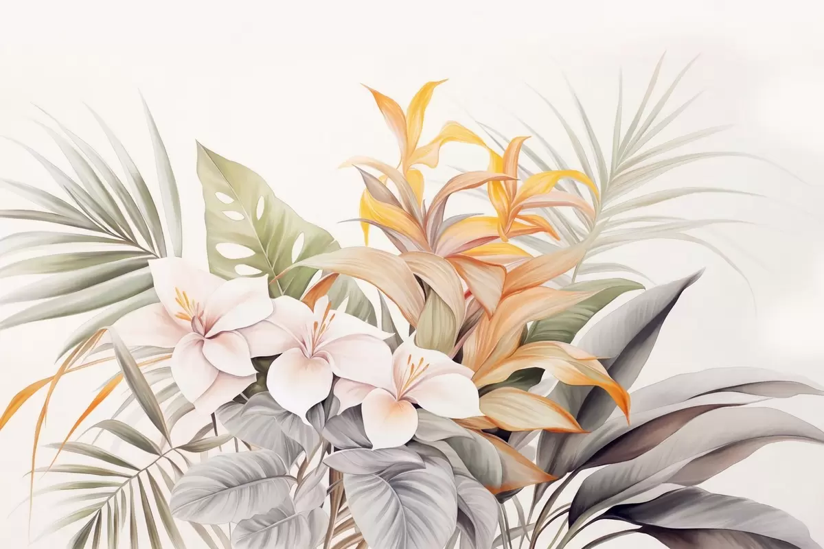 Valokuvatapetti Kasvitieteellinen kuvitus trooppisista kukista palmun ja monsteran lehdillä, pehmeät värit, vesivärityylinä Nr w09201