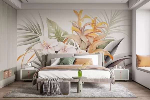 Valokuvatapetti Kasvitieteellinen kuvitus trooppisista kukista palmun ja monsteran lehdillä, pehmeät värit, vesivärityylinä Nr w09201
