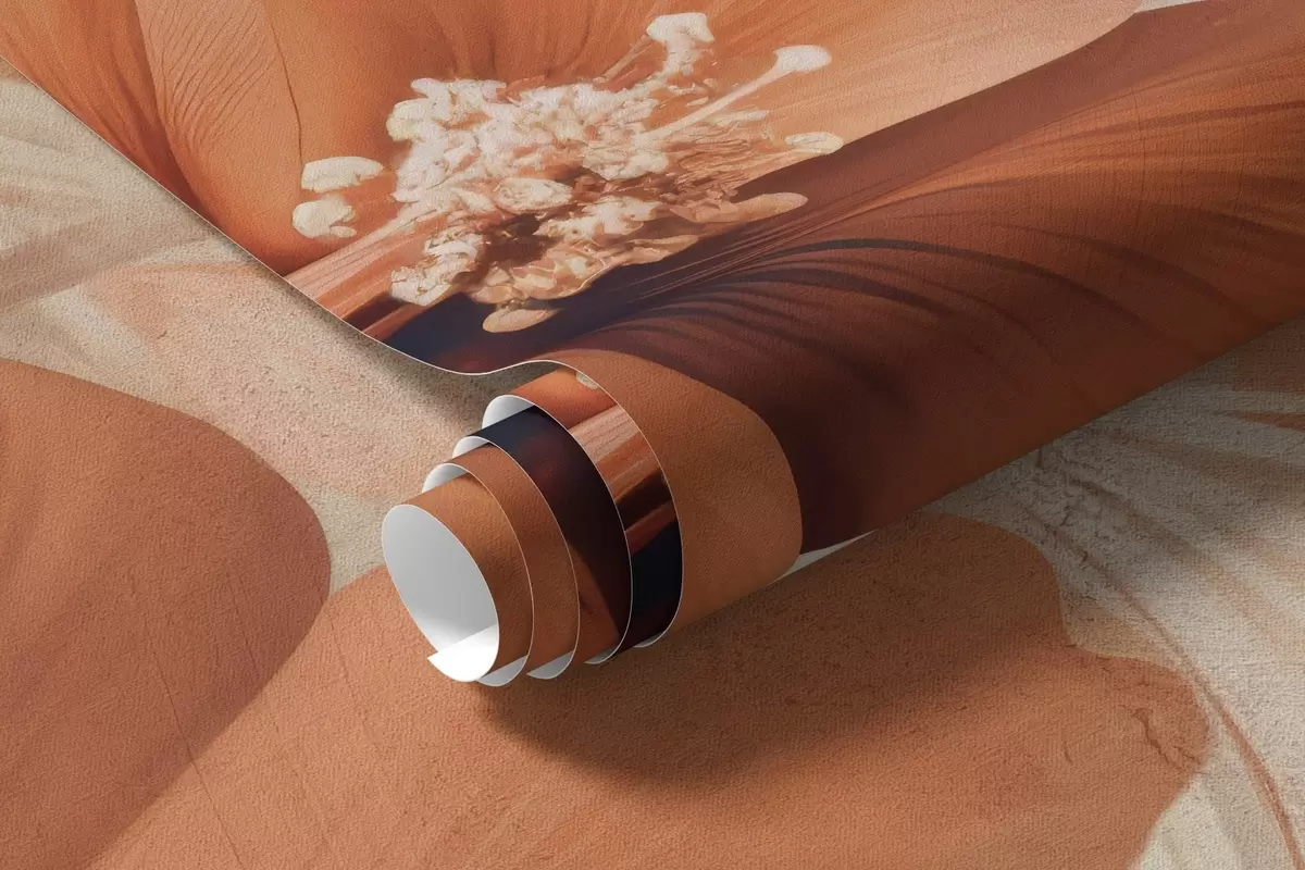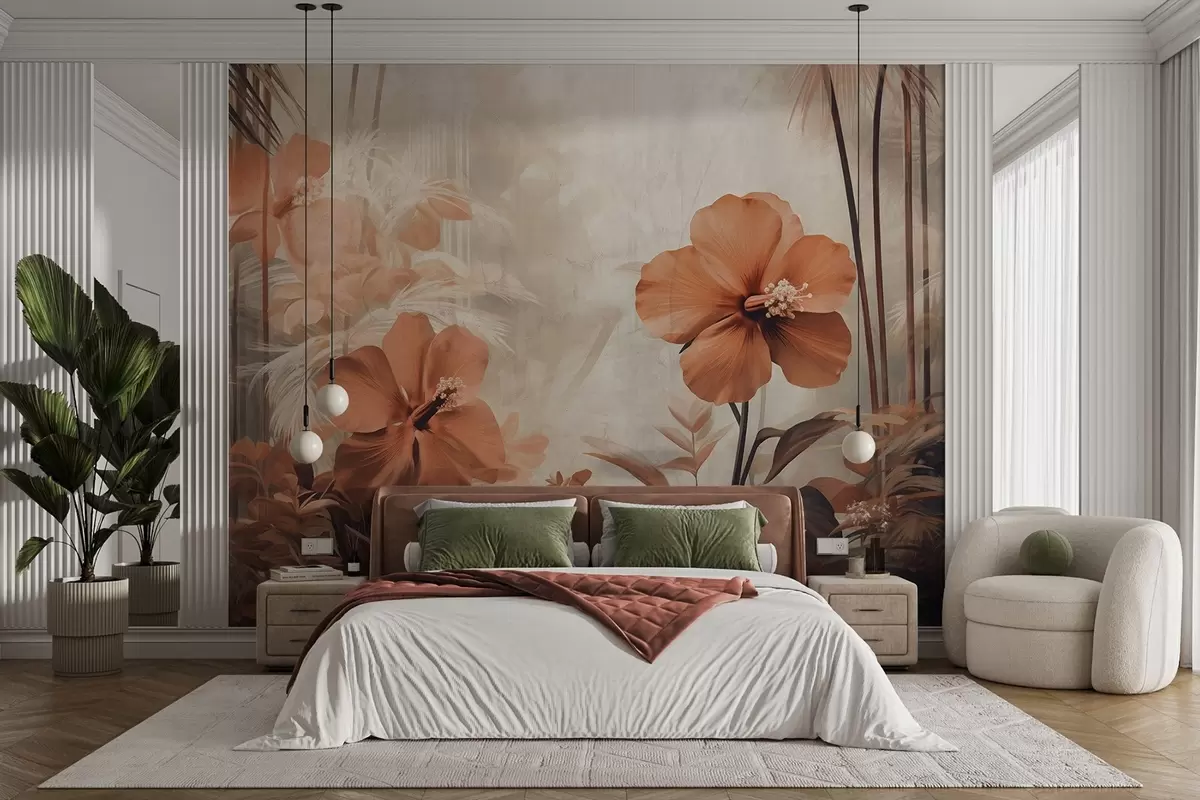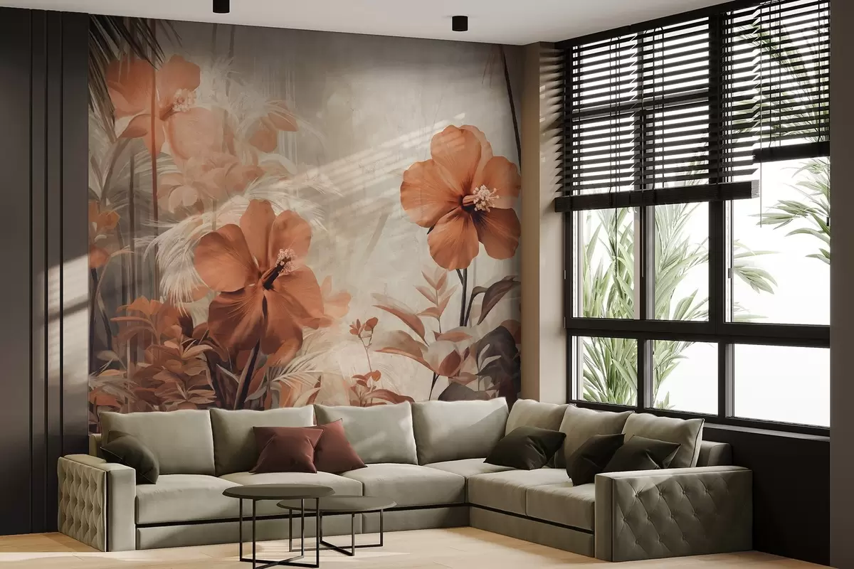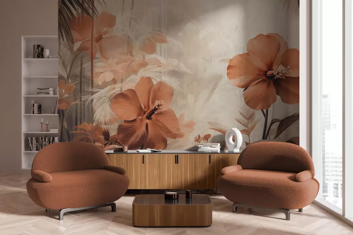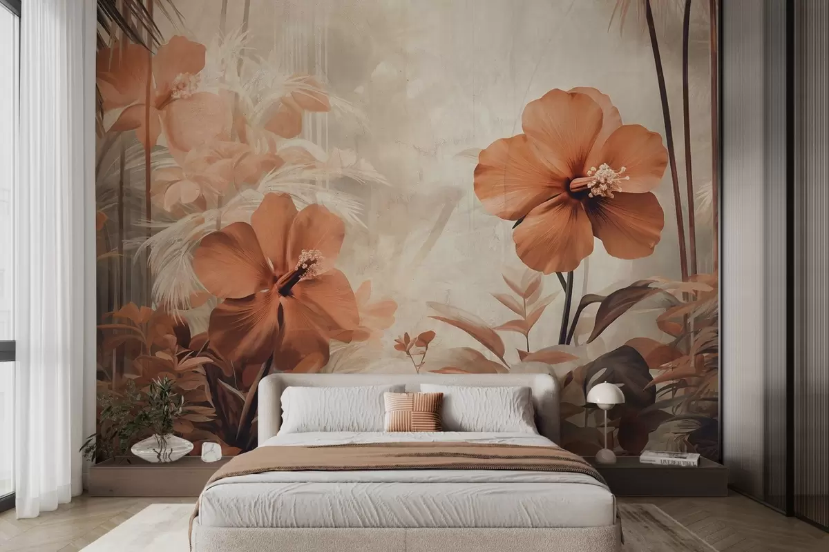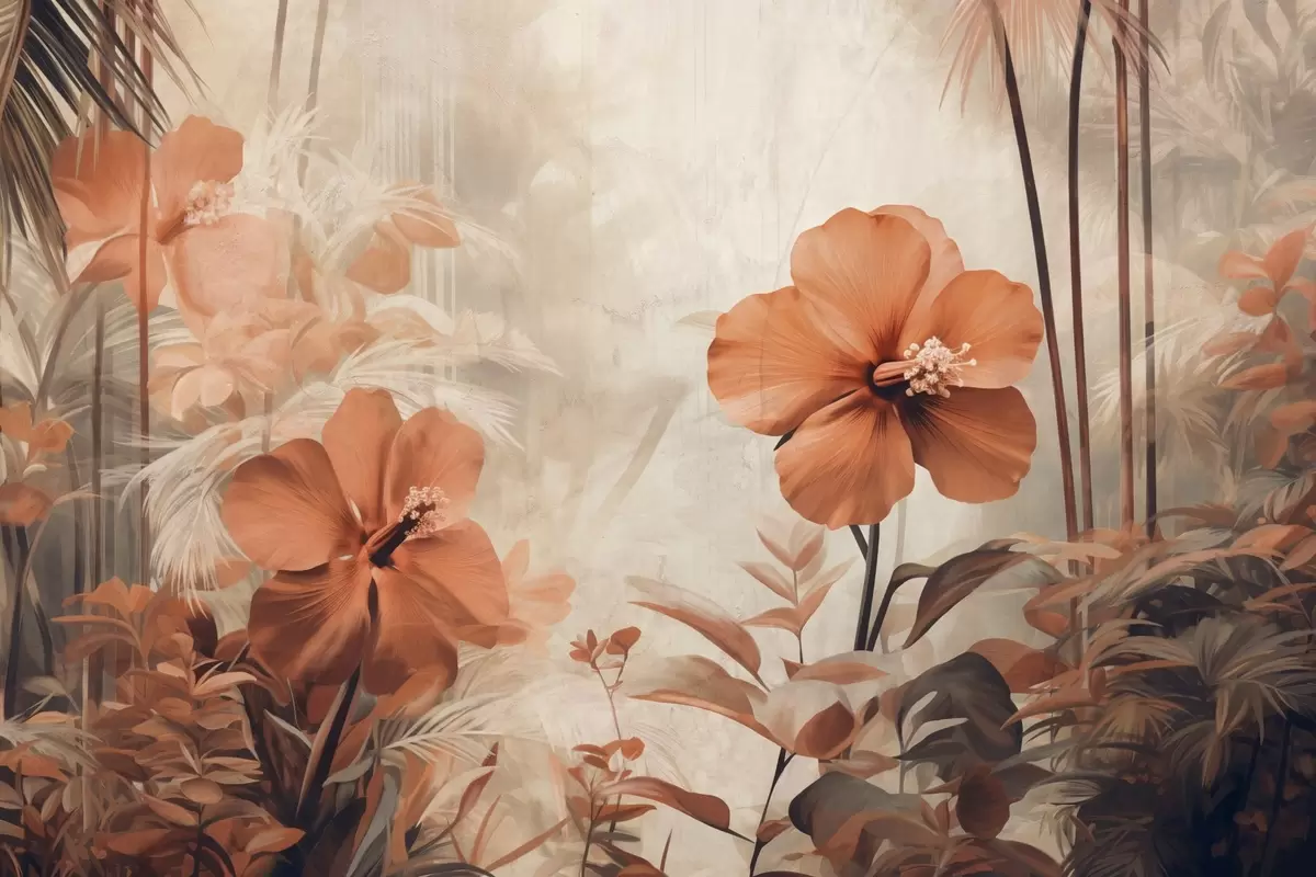 Valokuvatapetti Pastellinpunaisia hibiskuskukkia lehtien ja varsien kanssa, trooppinen kasvillisuus, pehmeät, hillityt värit, vintage-tyyliin Nr w09203