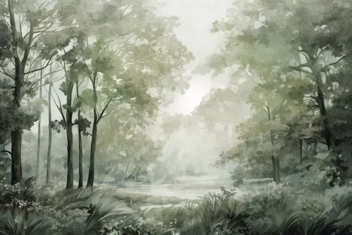 Valokuvatapetti Kuvioitu metsämaisema, puita vihreillä lehdillä, pastellivärimaailmaa Nr w09210v2