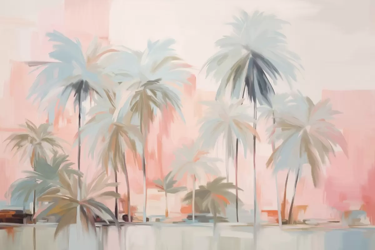 Valokuvatapetti Abstrakti minimalistinen pastelli trooppisia palmuja, taustalla pehmeän vaaleanpunainen ja persikka sävyjä Nr w09212