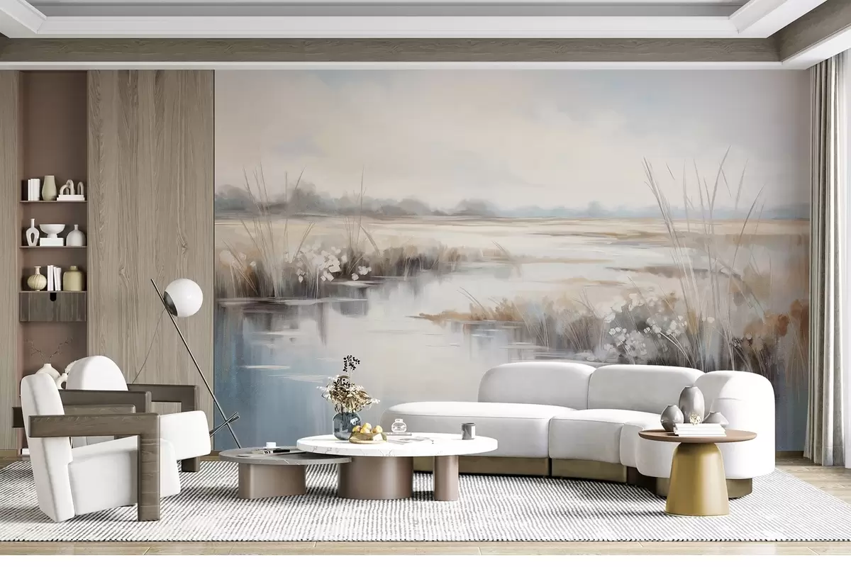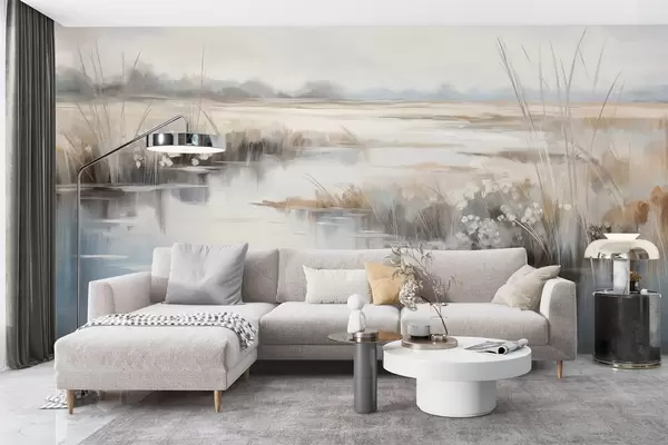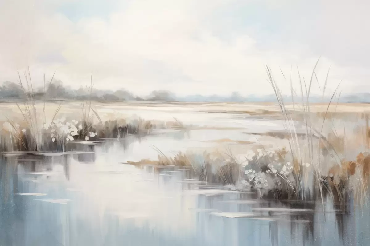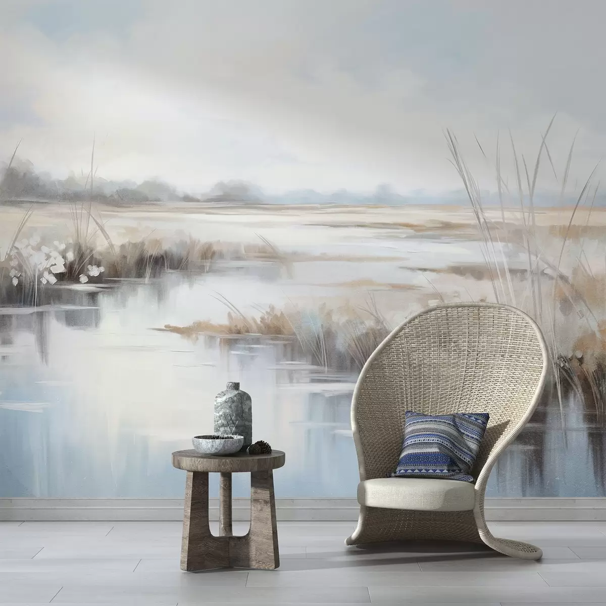Valokuvatapetti Teksturoitu rauhallinen maisema, jossa on korkeat ruohot ja rauhallinen vesi, pehmeät pastellivärit, kaukana olevat puut horisontissa Nr w09213
