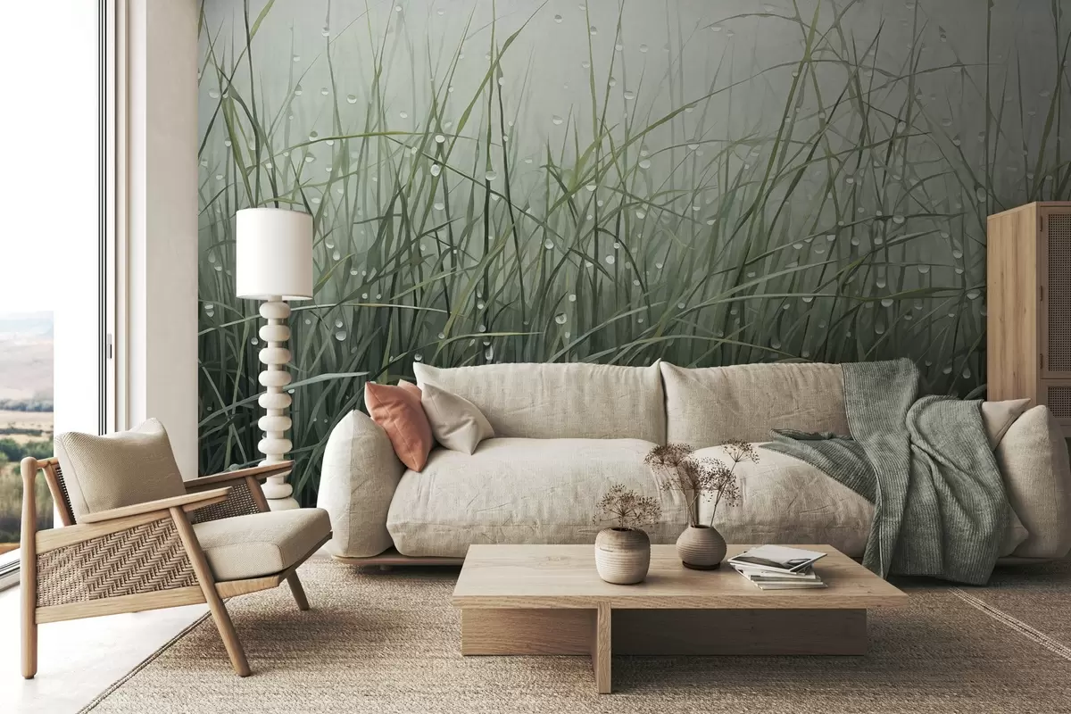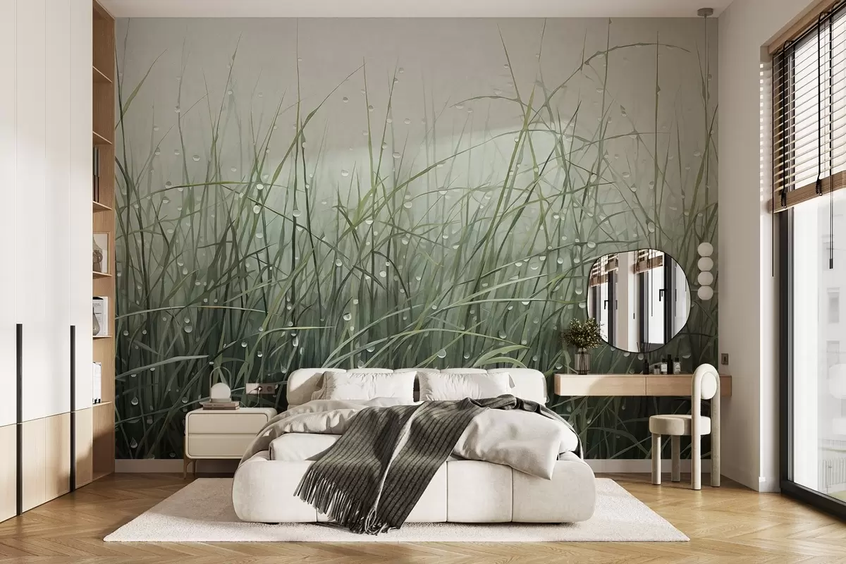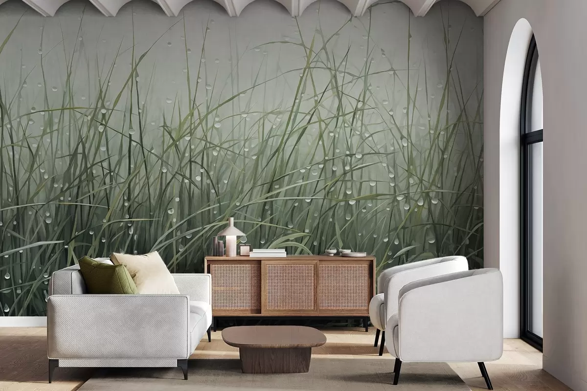Valokuvatapetti Ruohoa ja vesipisaroita, hillittyjä vihreitä sävyjä, pehmeä valo, sumuinen tausta, abstrakti minimalistinen kuvioitu tyyli Nr w09217