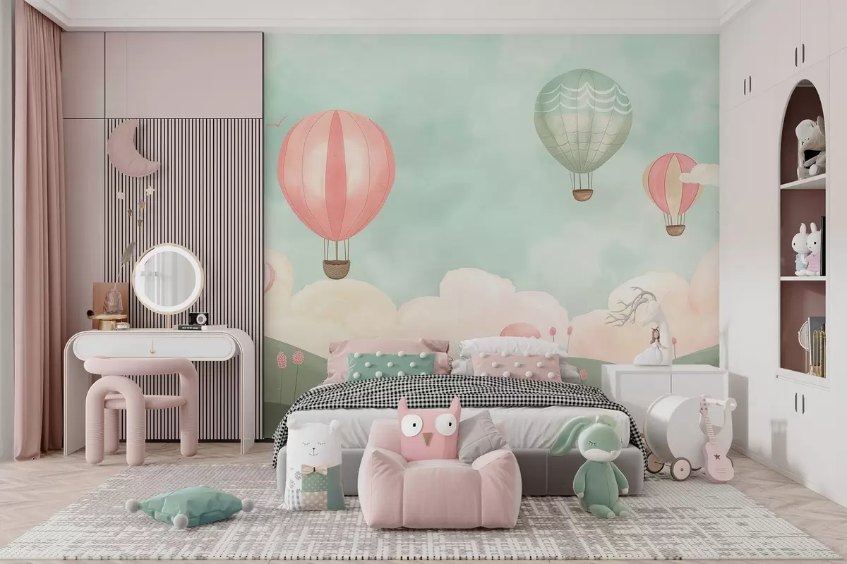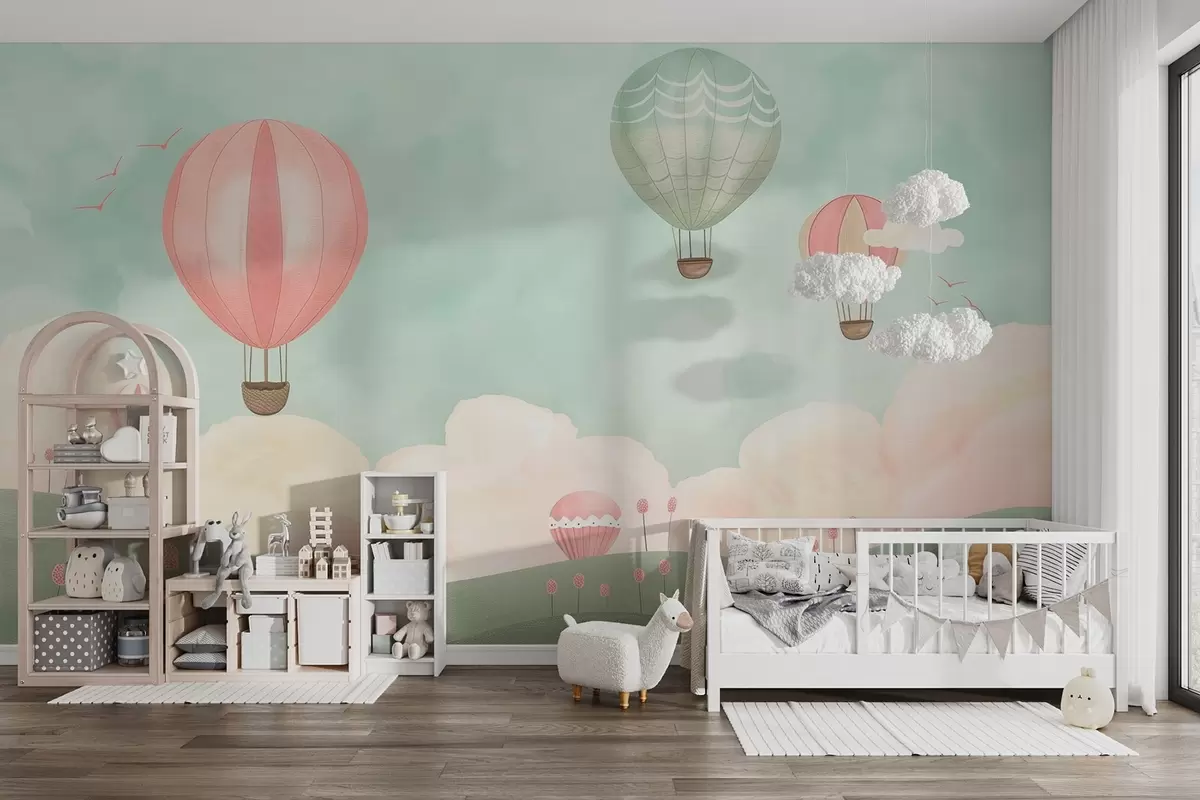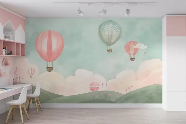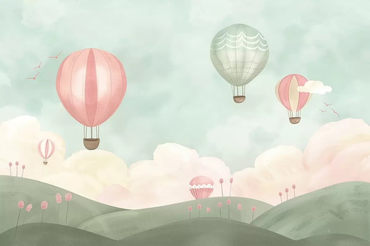 Valokuvatapetti Kuumailmapallot kukkuloiden ja pilvien yllä Nr w09228