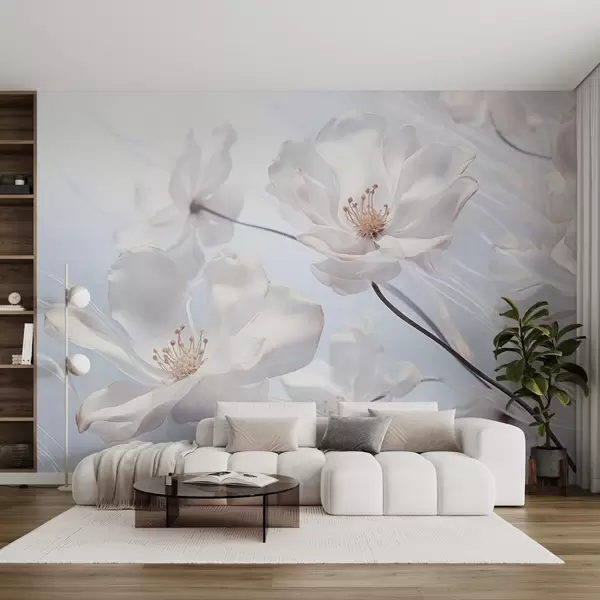 Valokuvatapetti Valkoiset kuvioidut läpinäkyvät kukat herkillä terälehdillä, pehmeä vaaleansininen tausta, elegantti, romanttinen, unenomainen Nr w09233