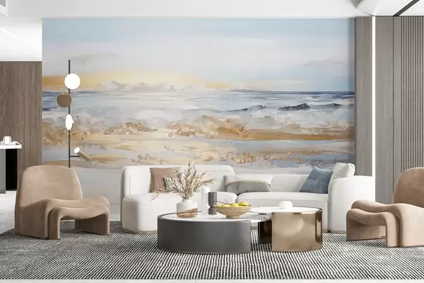 Valokuvatapetti Abstrakti kuvioitu maisema meren aallot törmäävät hiekkarannalla, pehmeät pastellivärit, sininen taivas ja kevyet pilvet Nr w09234