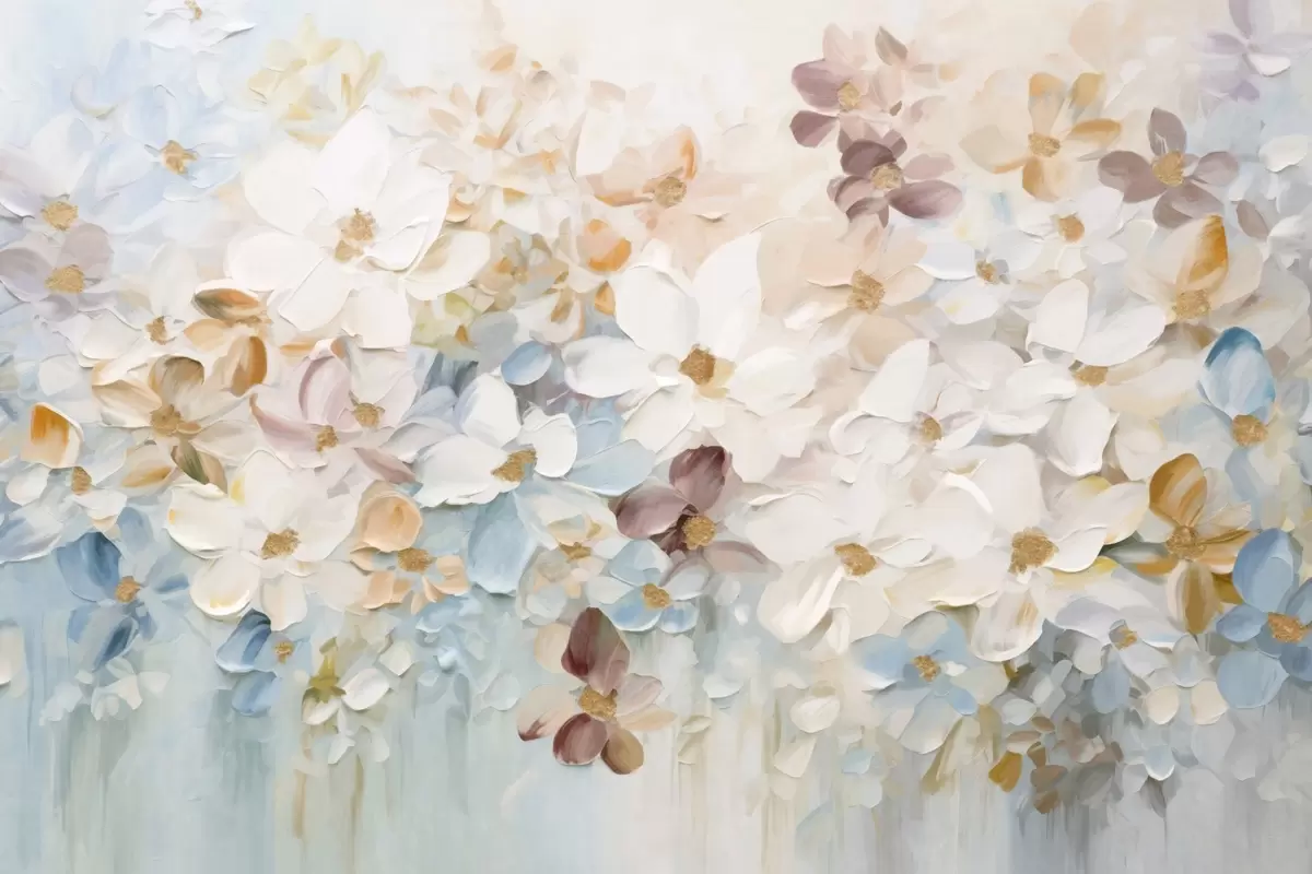 Valokuvatapetti Öljyvärimaalaus jäljitelmä kukkapuutarha valkoinen, sininen ja oranssi kukkia, pehmeä siveltimenvedot, pastelli hillittyjä värejä Nr w09236v1