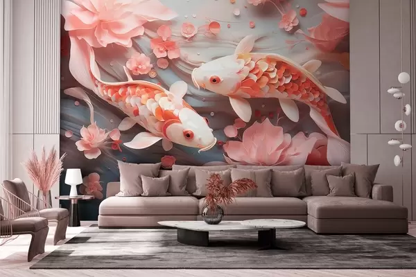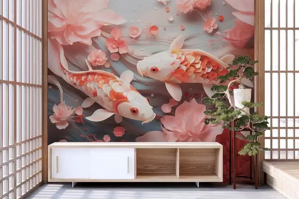 Valokuvatapetti Herkät kalat, joilla on mittasuhteiden mukaiset asteikot, uivat terälehtien ja pehmeän vaaleanpunaisten sävyjen läpi Nr w09237