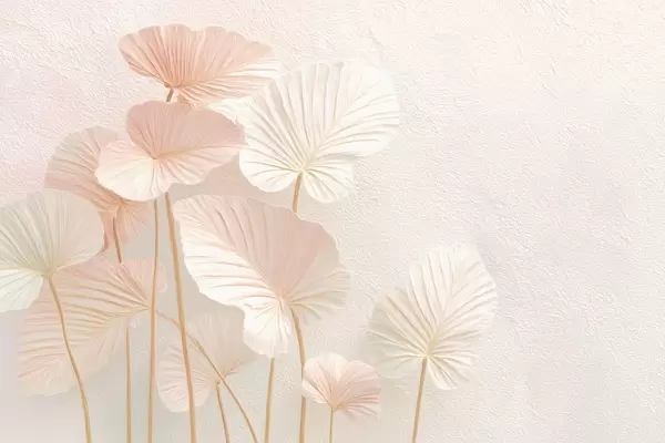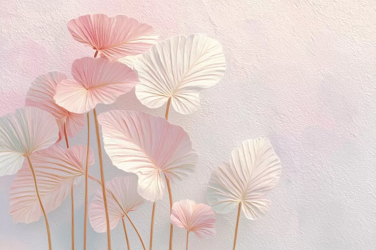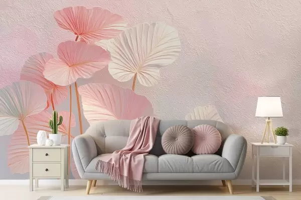 Valokuvatapetti Tyylikkäät suuret trooppiset lehdet pehmeän vaaleanpunaisen ja sinisen sävyissä Nr w09252