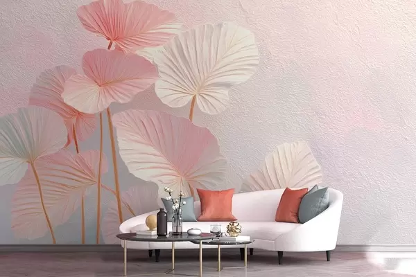 Valokuvatapetti Tyylikkäät suuret trooppiset lehdet pehmeän vaaleanpunaisen ja sinisen sävyissä Nr w09252