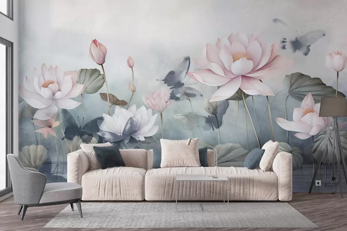Valokuvatapetti Lotus kuvioitu kukkia vaaleanpunainen pastelli terälehdet, vihreät lehdet, veden heijastus, pehmeät pastellivärit , akvarelli vaikutus w09254