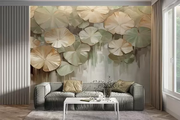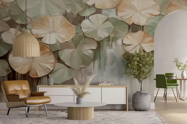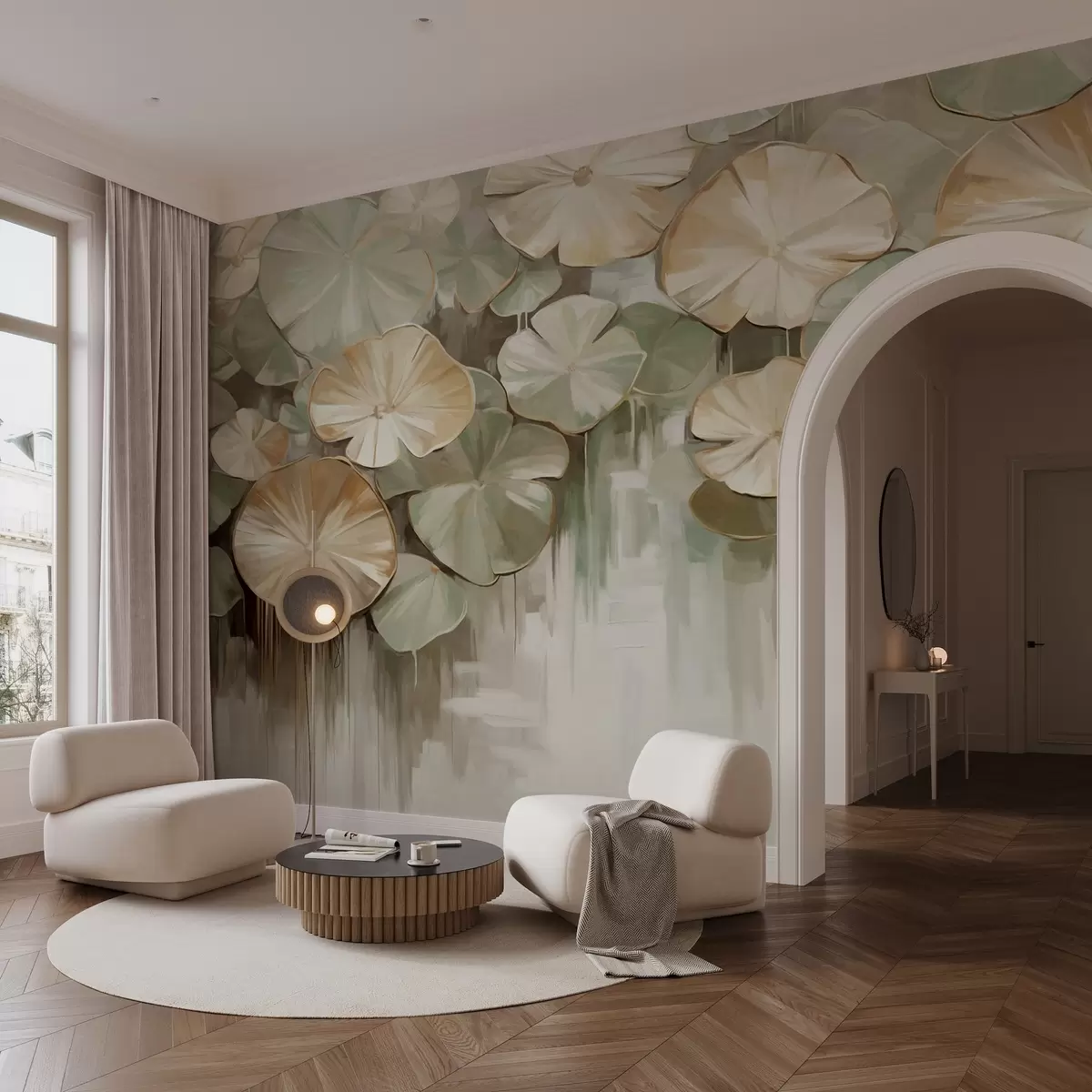 Valokuvatapetti Teksturoituja liljatyynyjä, joissa on vihreitä ja beigejä värejä lammessa, tausta on epäselvä sekoitus valkoista, vihreää ja ruskeaa Nr w09255