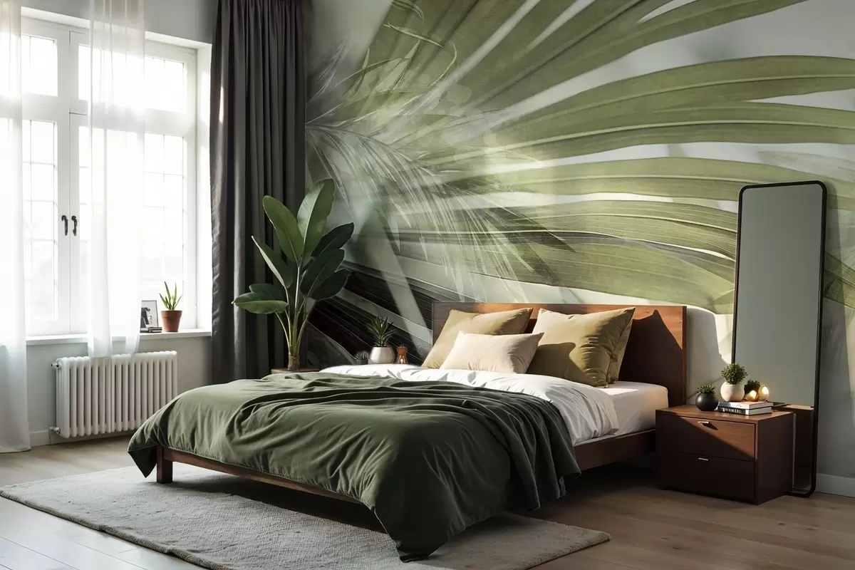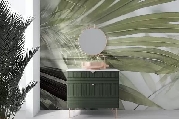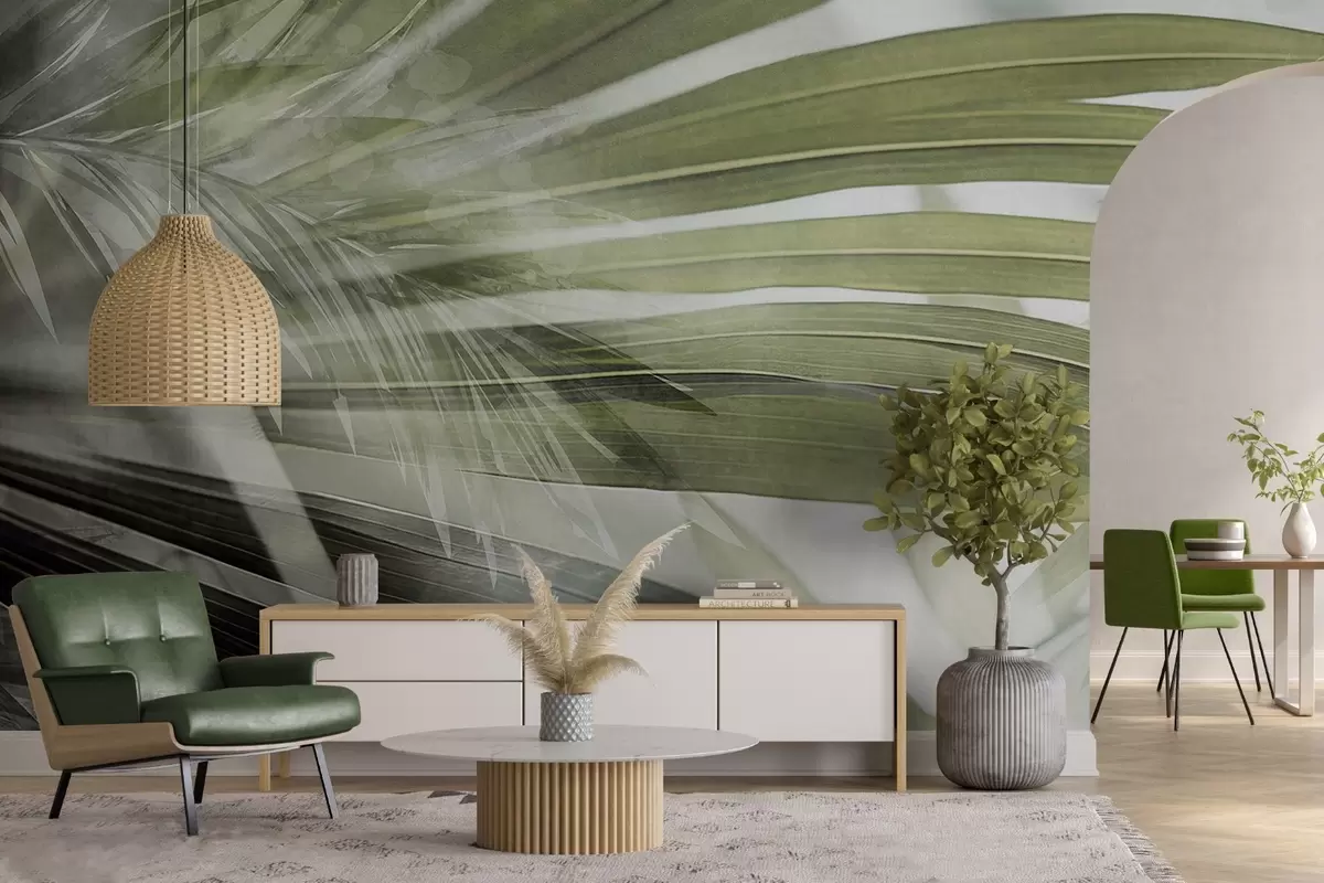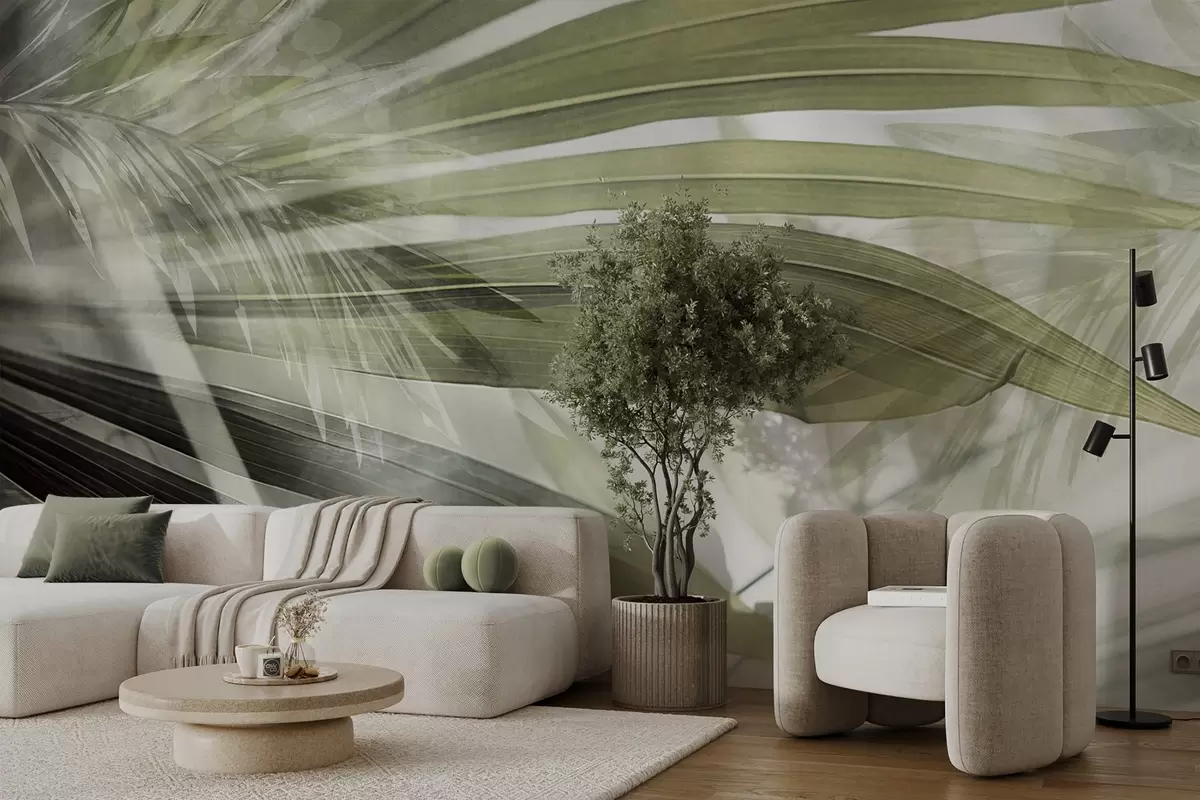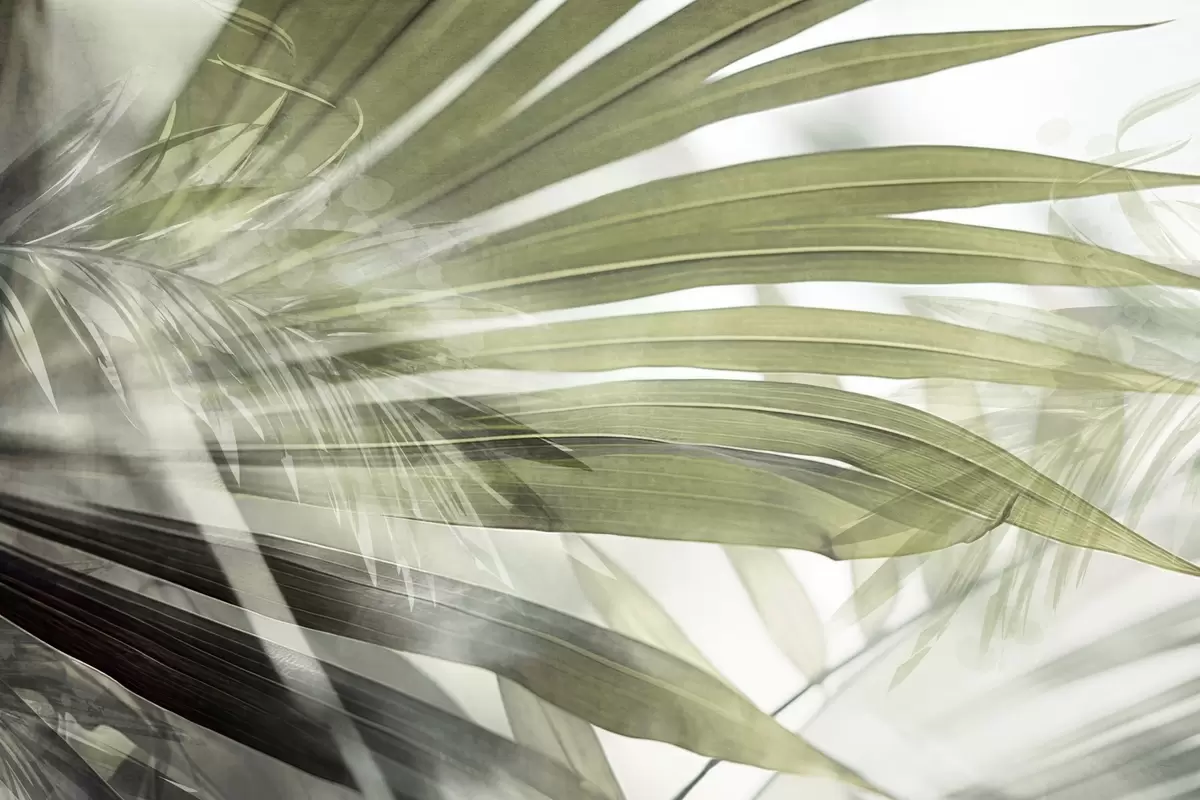 Valokuvatapetti Palmunlehdet, joissa on vaaleanvihreä sävy, päällekkäin ja luoden kerroksellisen vaikutelman pehmeää, neutraalia taustaa vasten Nr w09256v1