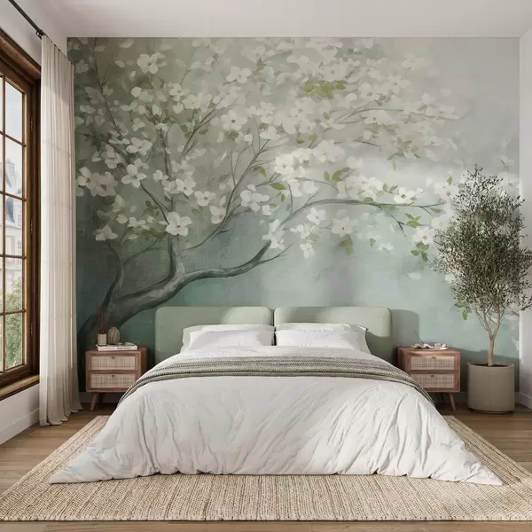 Valokuvatapetti Kukkiva puu, jonka valkoiset kukat ovat täydessä kukassa, rakeista, meluisaa, mykistävän sinistä ja vihreää taustaa vasten Nr w09261