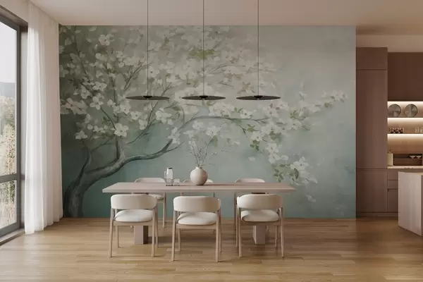 Valokuvatapetti Kukkiva puu, jonka valkoiset kukat ovat täydessä kukassa, rakeista, meluisaa, mykistävän sinistä ja vihreää taustaa vasten Nr w09261