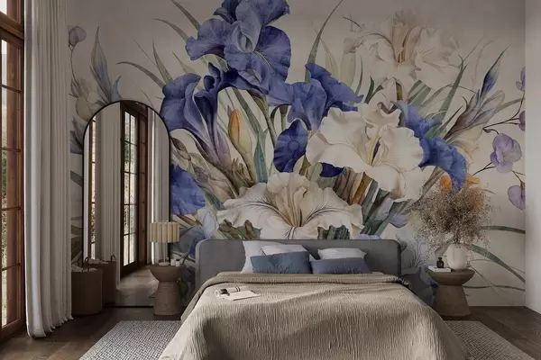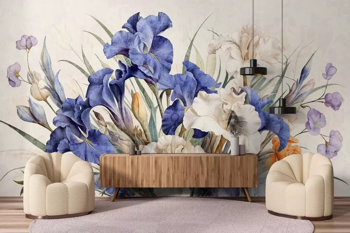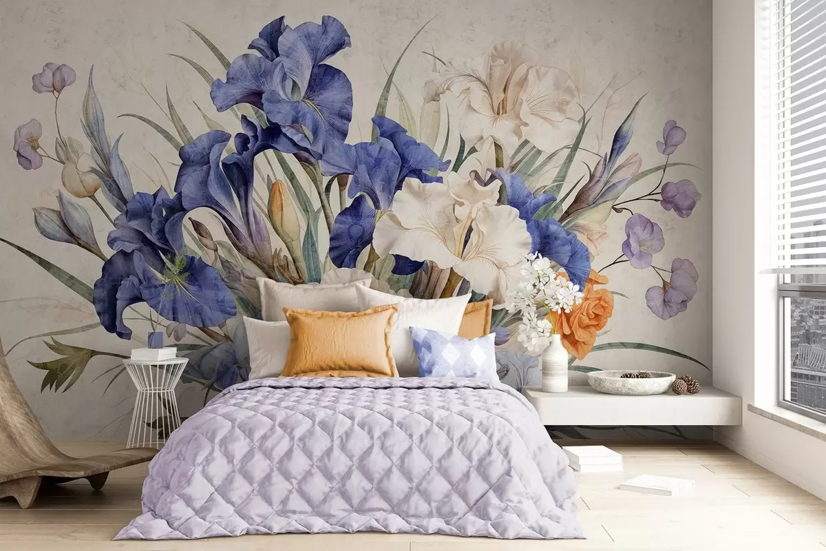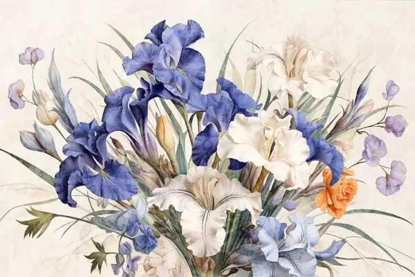 Valokuvatapetti Vintage kuvioitu kimppu violetteja iiriksiä, jotka on järjestetty vihreiden lehtien ja varsien kanssa pehmeää taustaa vasten Nr w09263