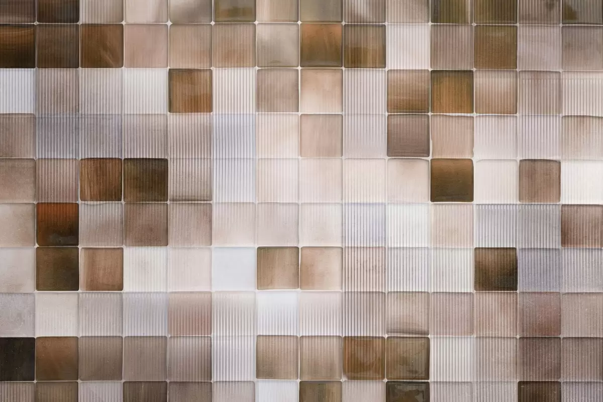 Valokuvatapetti Neliön muotoiset mosaiikkikivilaatat ruskean, beigen ja valkoisen sävyissä, joissa on abstrakti uurrettu rakeinen meluisa rakenne Nr w09269