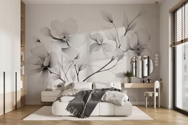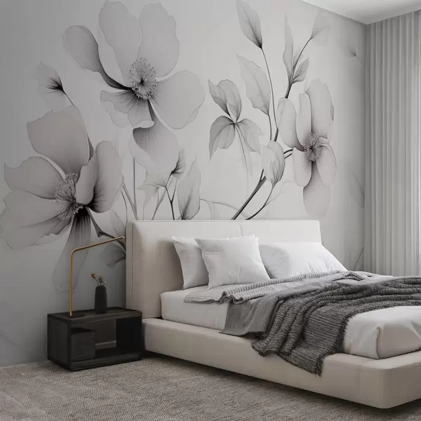 Valokuvatapetti Mustavalkoisia kukkia, joissa on tyylikkäitä viivoja harmaalla pohjalla Nr w09271