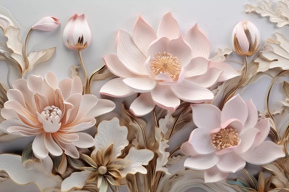 Valokuvatapetti Volumetriset vaaleanpunaiset kukat keltaisilla lehdillä Nr w09277