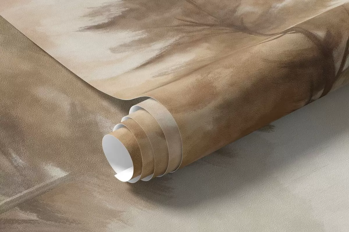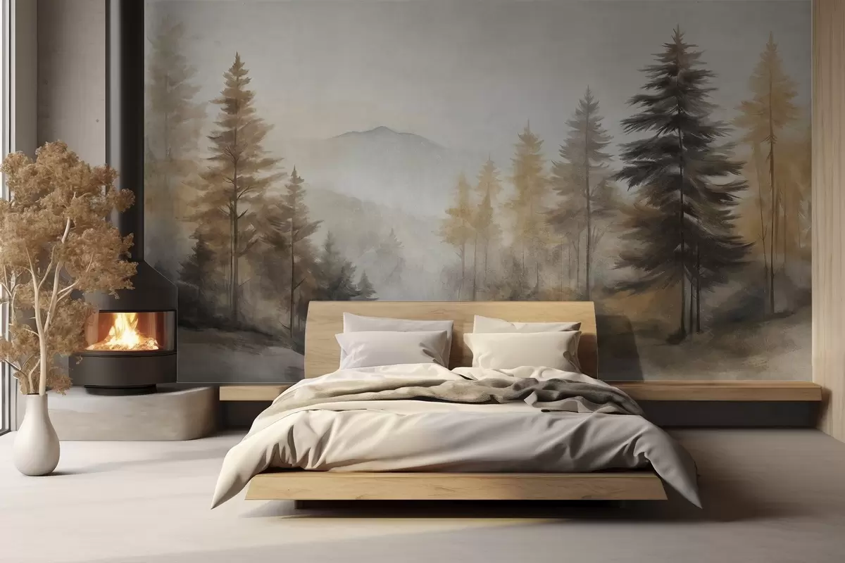 Valokuvatapetti Teksturoitu syksyinen metsä, jossa on korkeita mäntyjä ja vuoria taustalla, värit ovat hillittyjä ja maanläheisiä maalaustyyliin Nr w09290