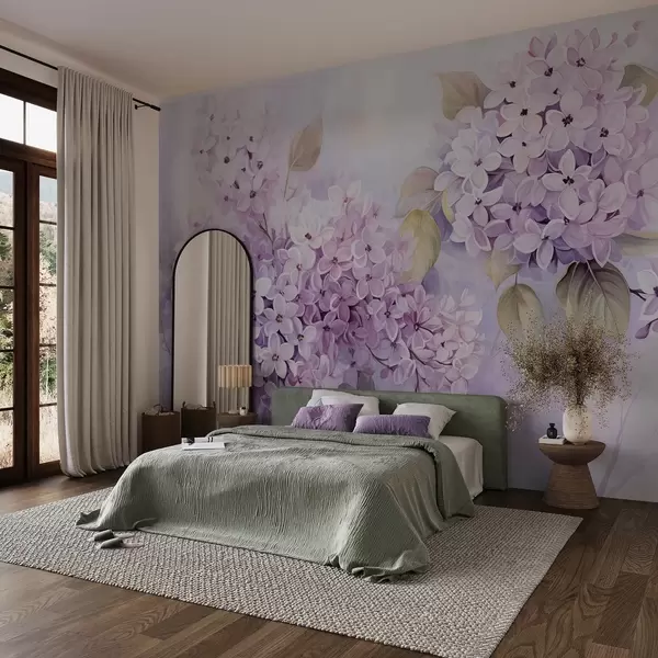 Valokuvatapetti Lilac kuvioitu kukkia vaalean violetti terälehdet, vaaleanvihreät lehdet, akvarelli tyyli, pehmeä, pastellivärit, herkkä siveltimenvedot Nr w09291