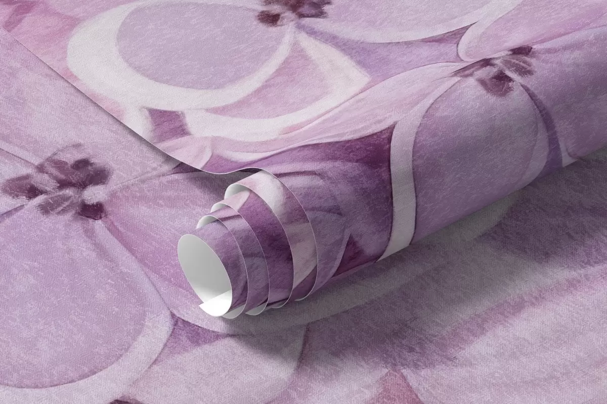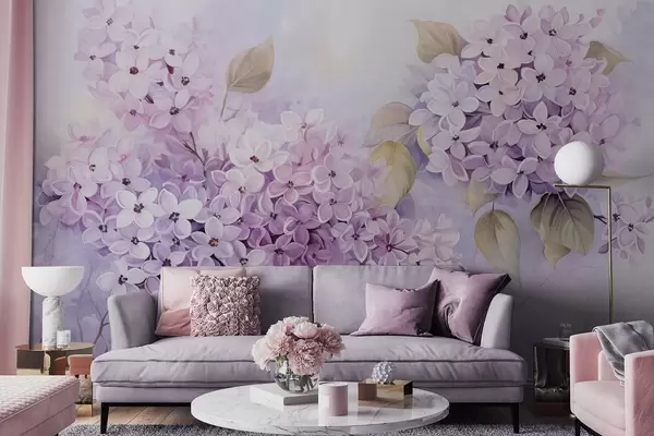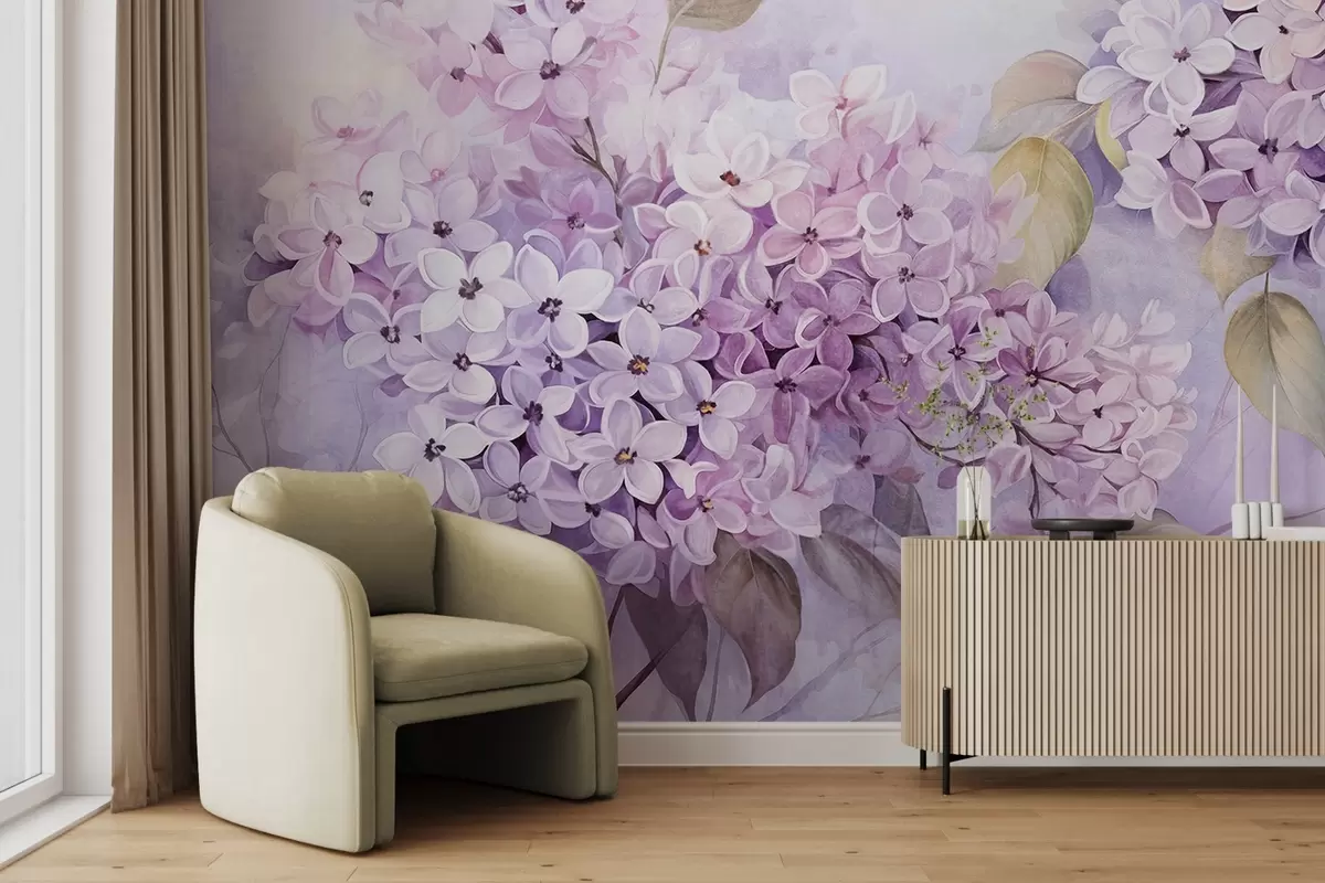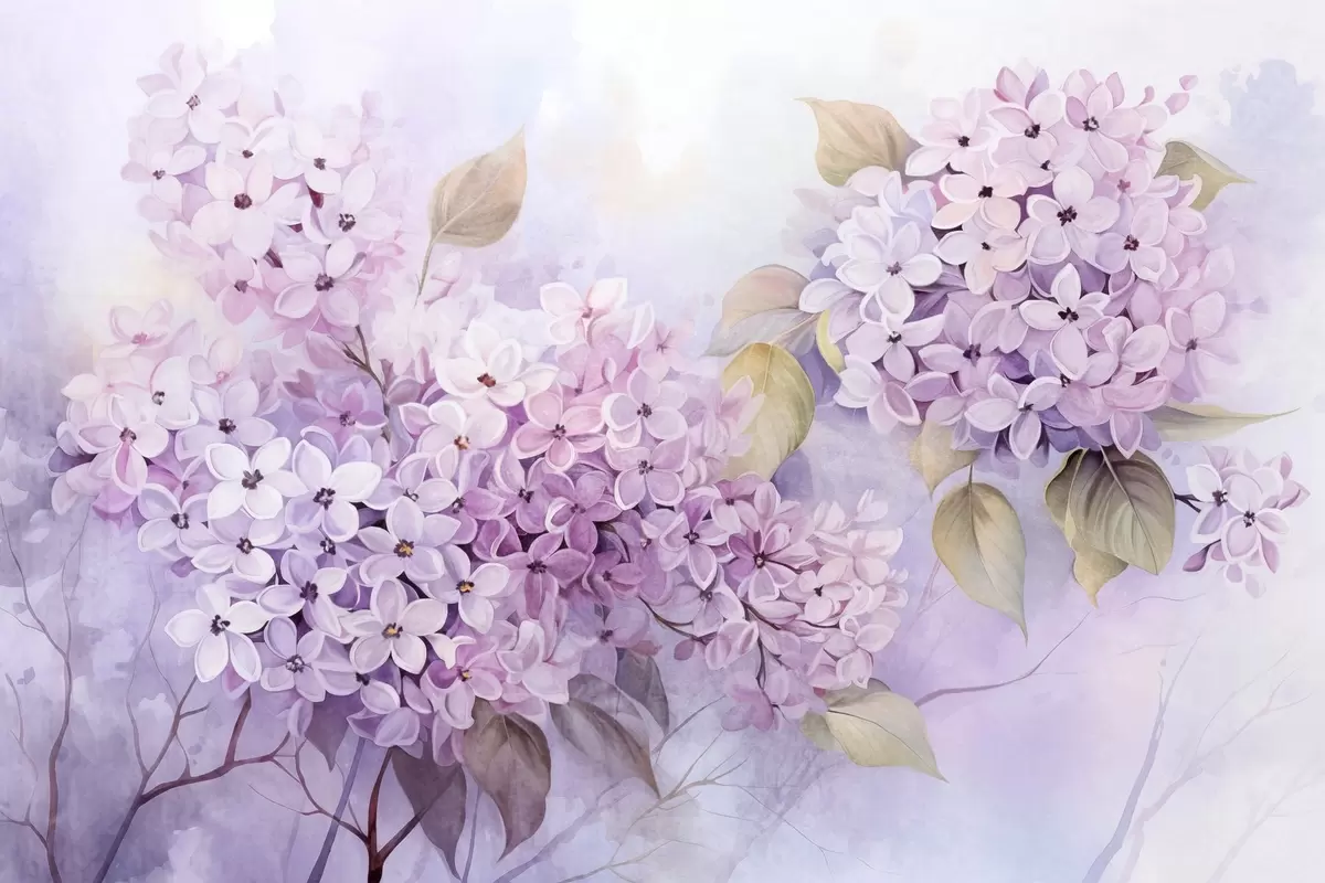 Valokuvatapetti Lilac kuvioitu kukkia vaalean violetti terälehdet, vaaleanvihreät lehdet, akvarelli tyyli, pehmeä, pastellivärit, herkkä siveltimenvedot Nr w09291