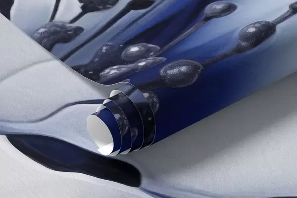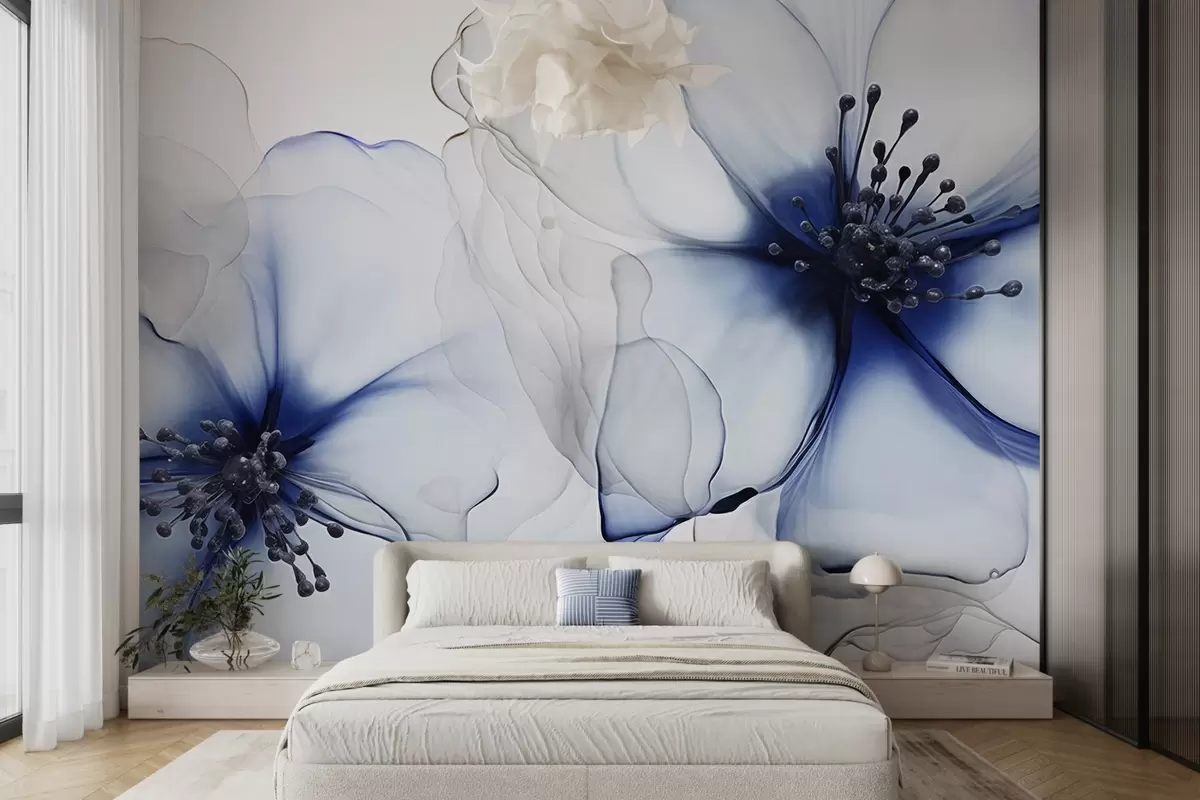 Valokuvatapetti Kaksi läpikuultavaa kuvioitua sinistä kukkaa, joissa on näkyvät heteet, päällekkäiset hennot terälehdet ja pehmeä, virtaava rakenne Nr w09295v1