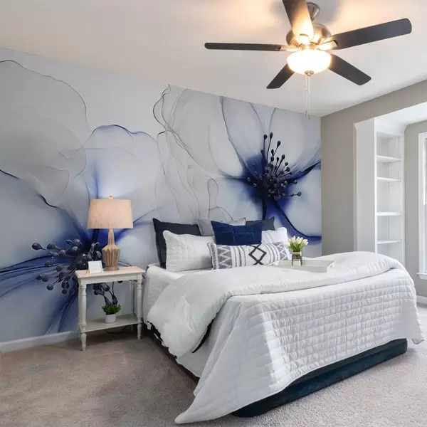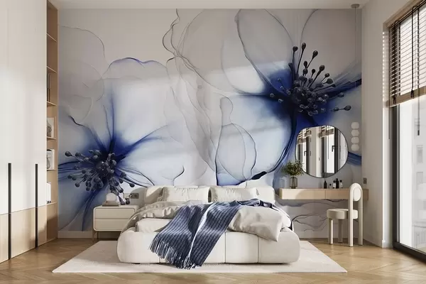 Valokuvatapetti Kaksi läpikuultavaa kuvioitua sinistä kukkaa, joissa on näkyvät heteet, päällekkäiset hennot terälehdet ja pehmeä, virtaava rakenne Nr w09295v1