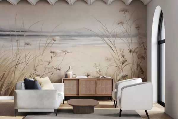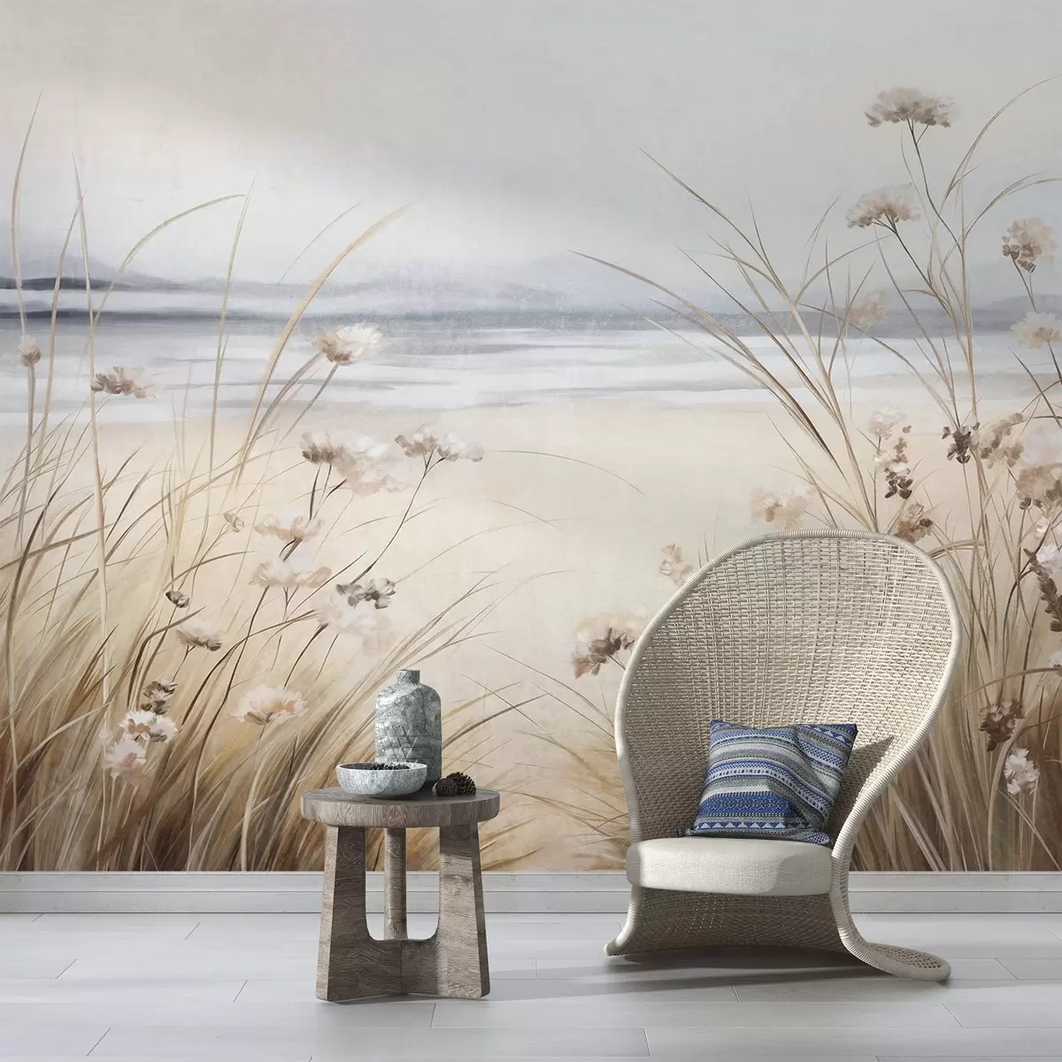 Valokuvatapetti Etualalla vehnäpelto, jossa on valkoisia kukkia, taustalla ranta ja meri, neutraalit pastellivärit, hillityt värit Nr w09298